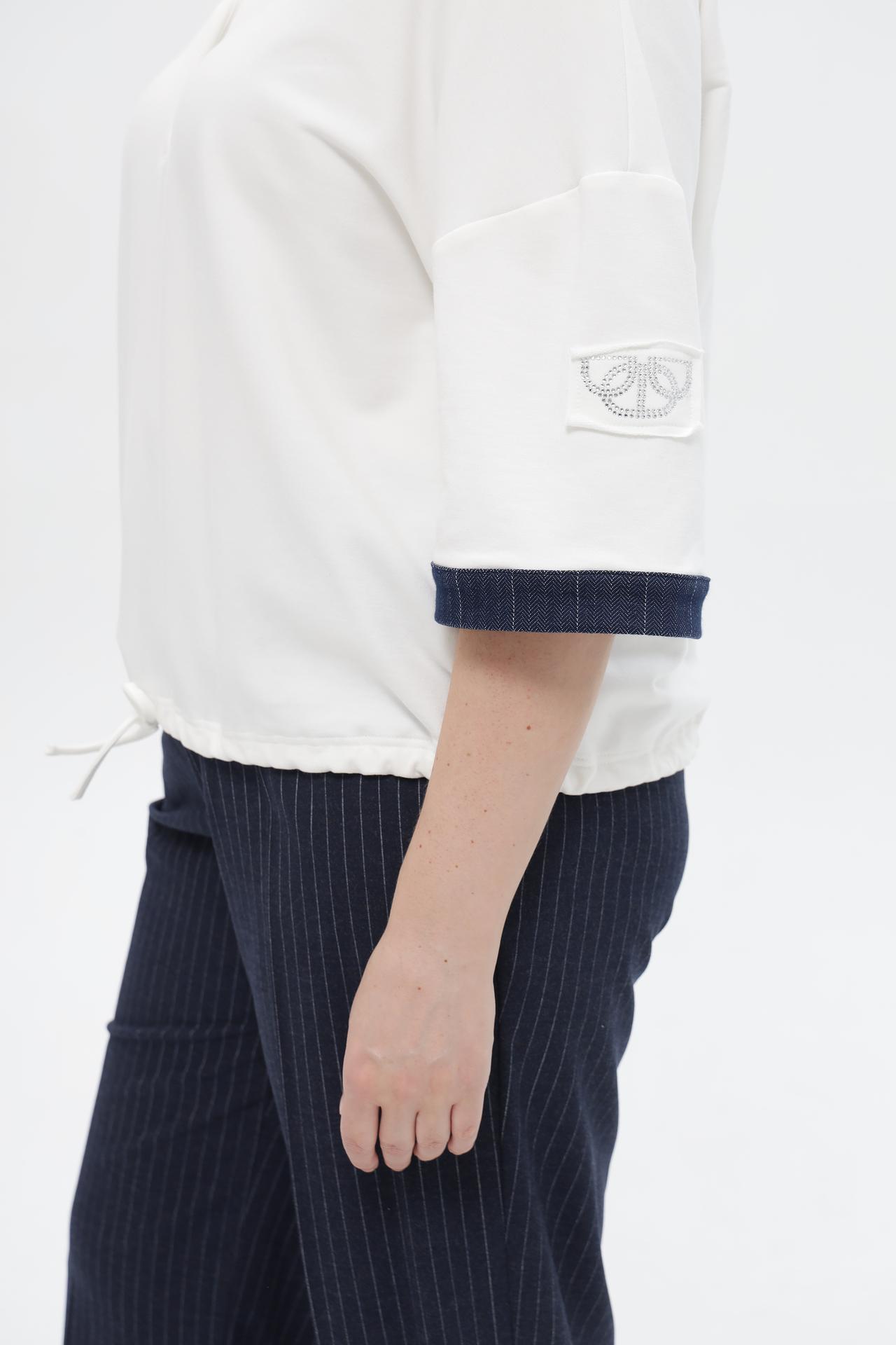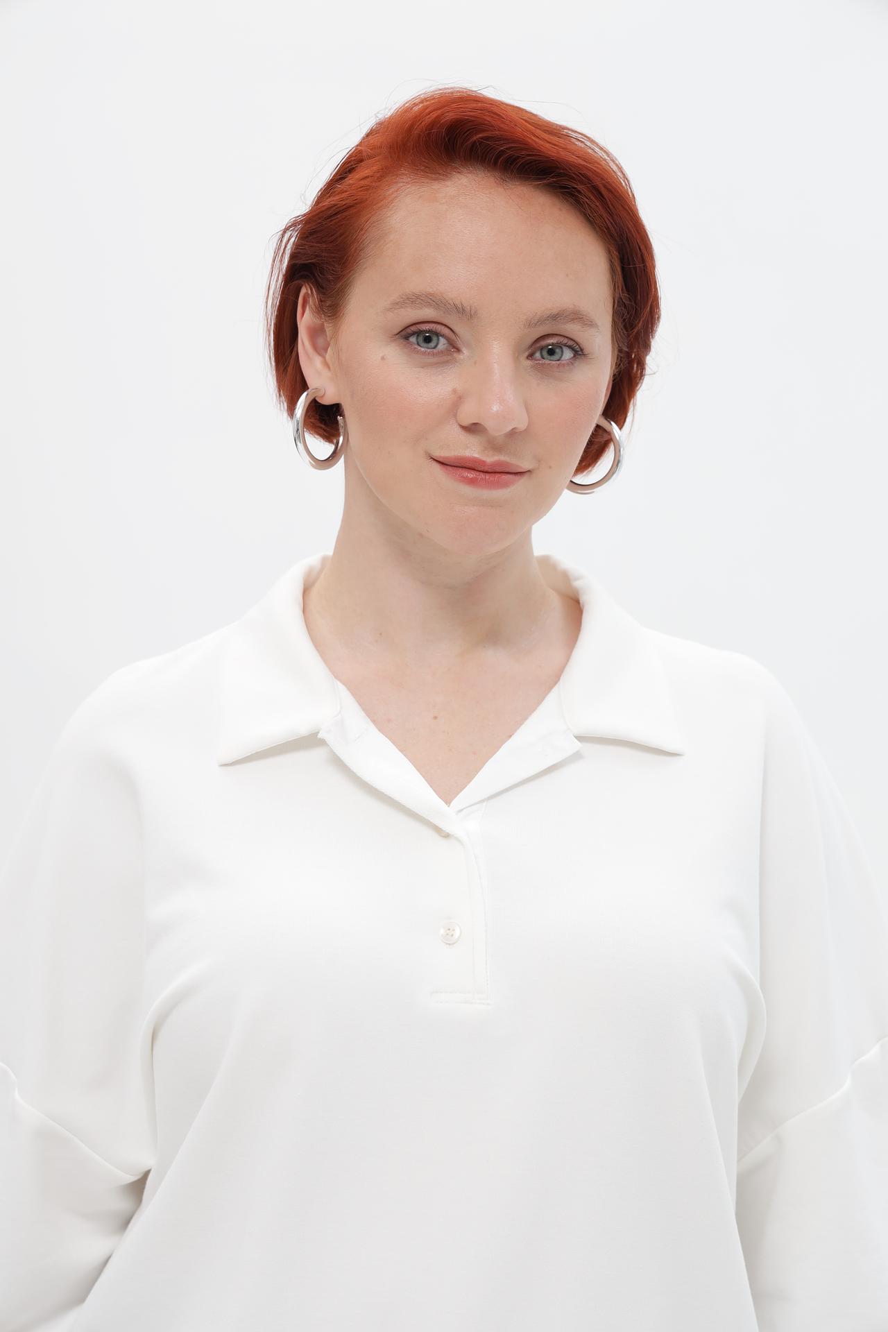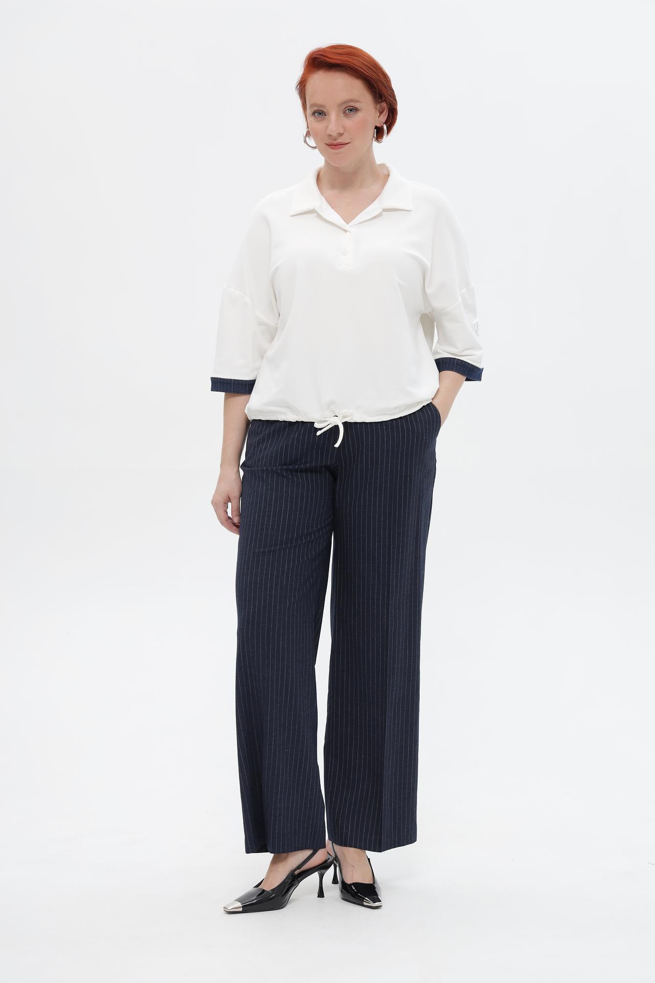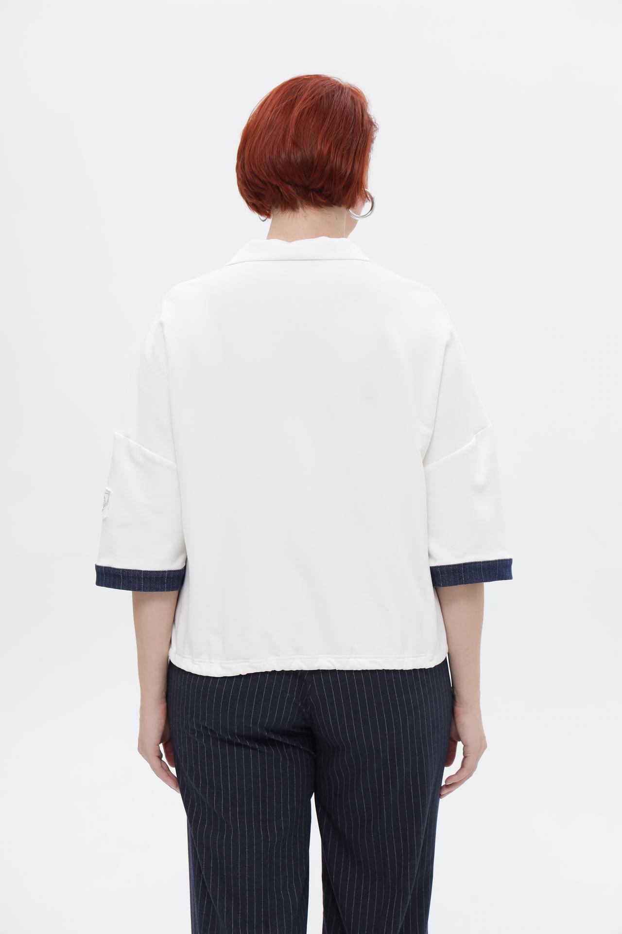 - Дизайн: Классический крой с воротником-поло и современной деталью в виде кулиски по низу. Универсальный белый цвет легко сочетается с различными предметами гардероба, а контрастные манжеты добавляют актуальности.
