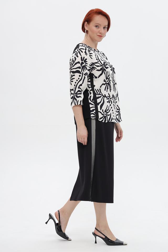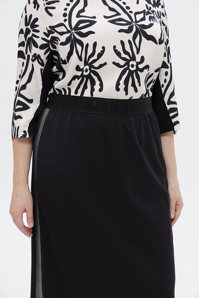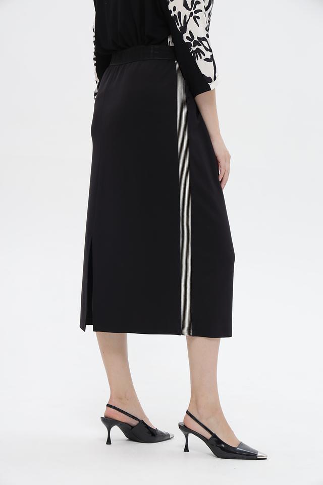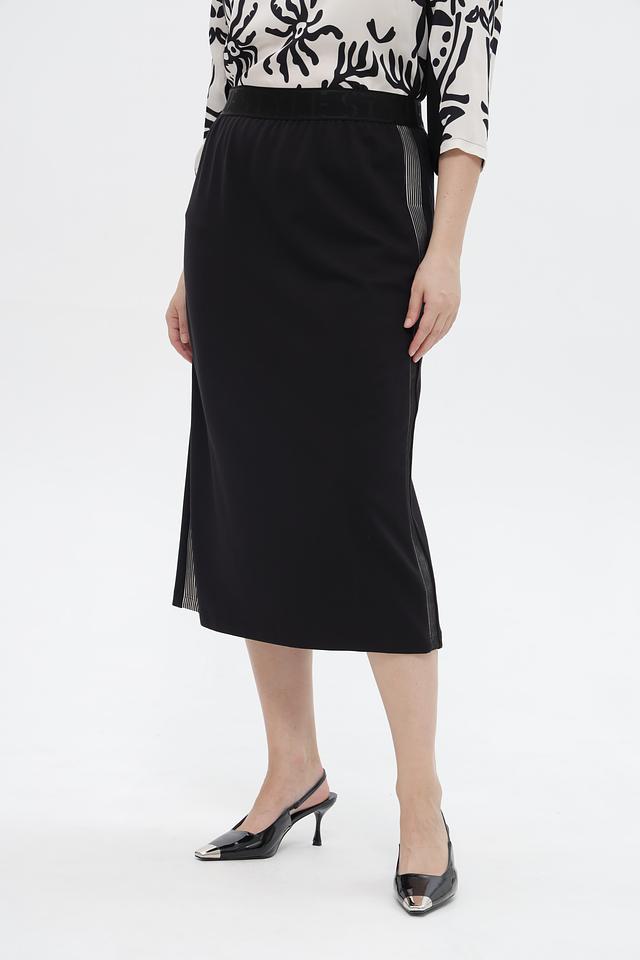 Чёрная юбка Tuzzi миди длины с декоративными полосками по бокам. Изготовлена из модала с добавлением полиэстера и эластана для комфорта и хорошей посадки. Состав: модал 55%, полиэстер 39%, эластан 6%