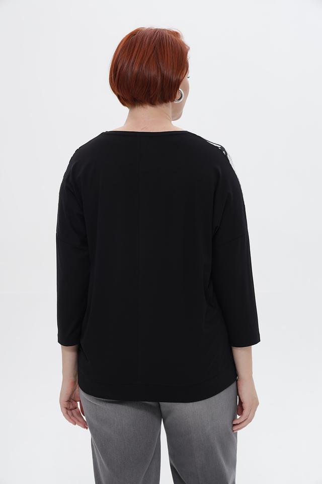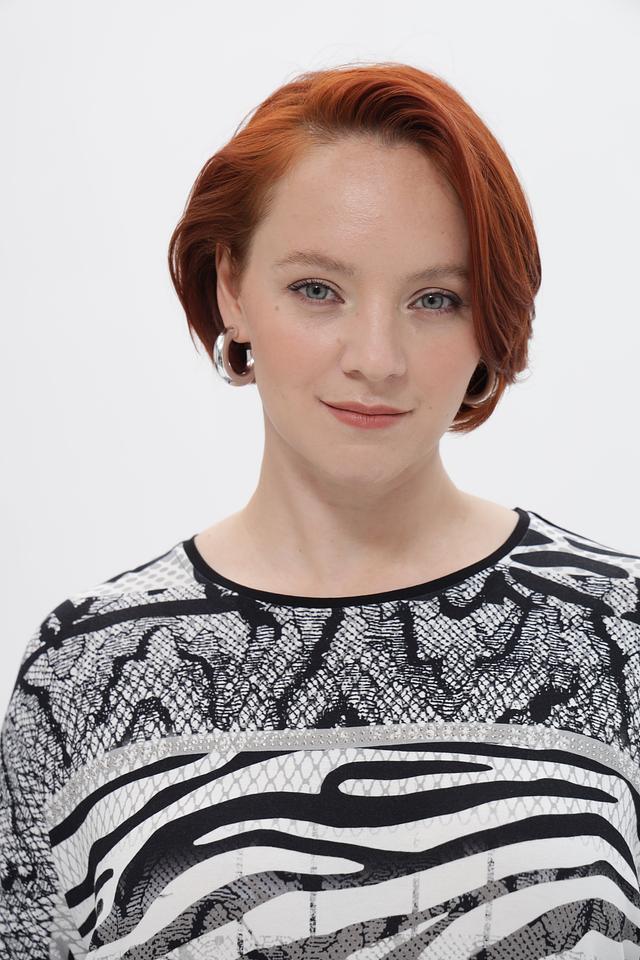 Передняя часть футболки украшена эффектным принтом, сочетающим в себе различные узоры: имитацию змеиной кожи, полоски, напоминающие зебру, и мелкий горошек. Рукава 3/4 и круглый вырез горловины придают модели лаконичный и универсальный вид.