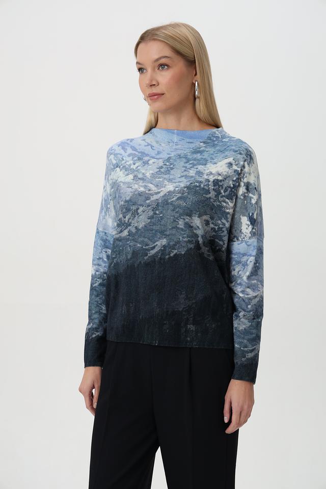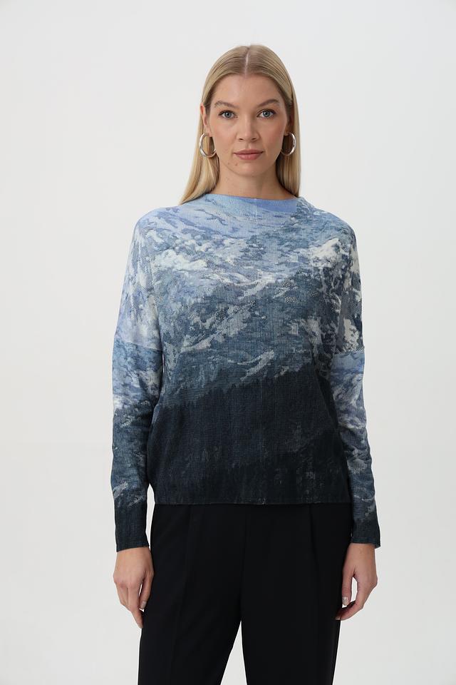 Этот стильный пуловер от бренда Tuzzi станет прекрасным дополнением к вашему гардеробу. Модель выполнена в синих тонах и украшена эффектным принтом, изображающим горный пейзаж.