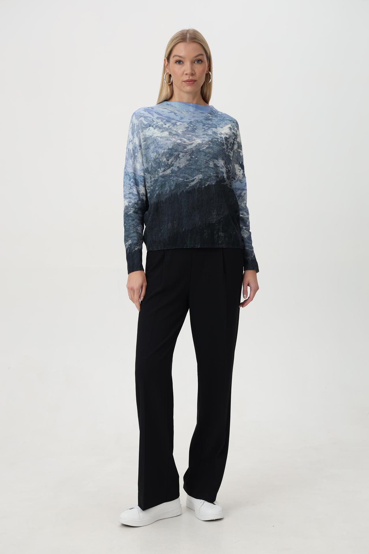 Элегантный женский пуловер от Tuzzi станет изысканным дополнением вашего гардероба. Оригинальный градиентный узор, напоминающий морские волны или горные пейзажи, придает изделию особую глубину и динамичность. Модель выполнена в синих оттенках, переходящих от светлого к темно-синему, создавая завораживающий визуальный эффект.