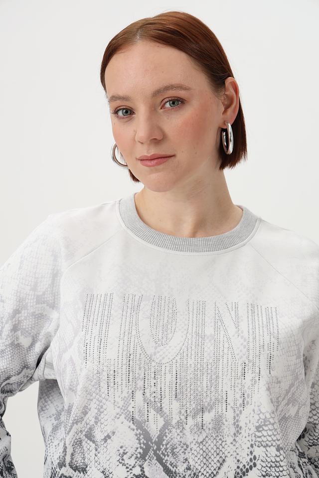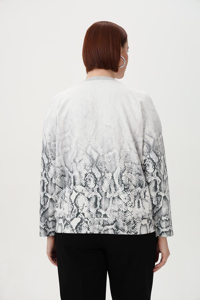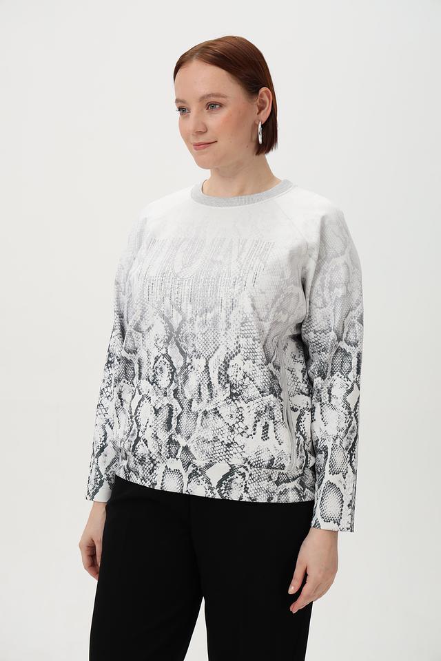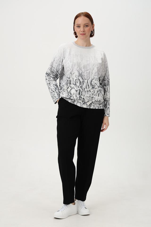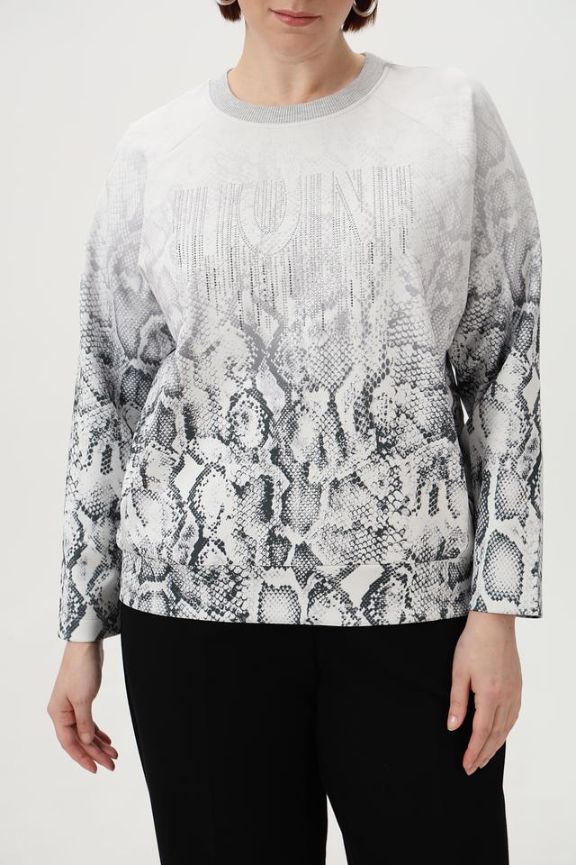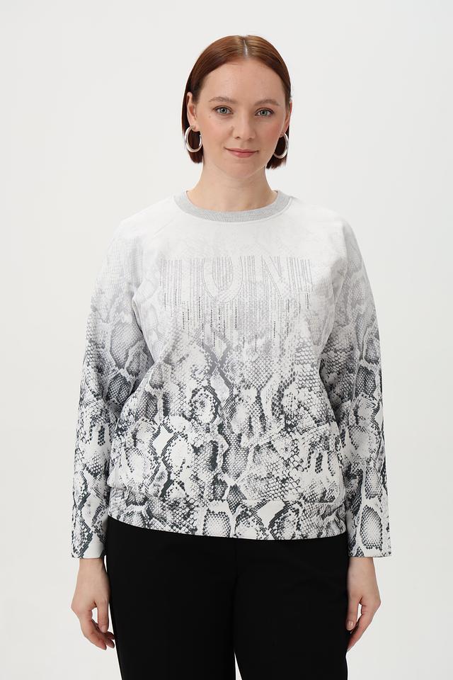 Пуловер имеет свободный крой, длинные рукава и круглый вырез. Особенностью модели является эффектный принт, имитирующий змеиную кожу, который придает ей современный и стильный вид.