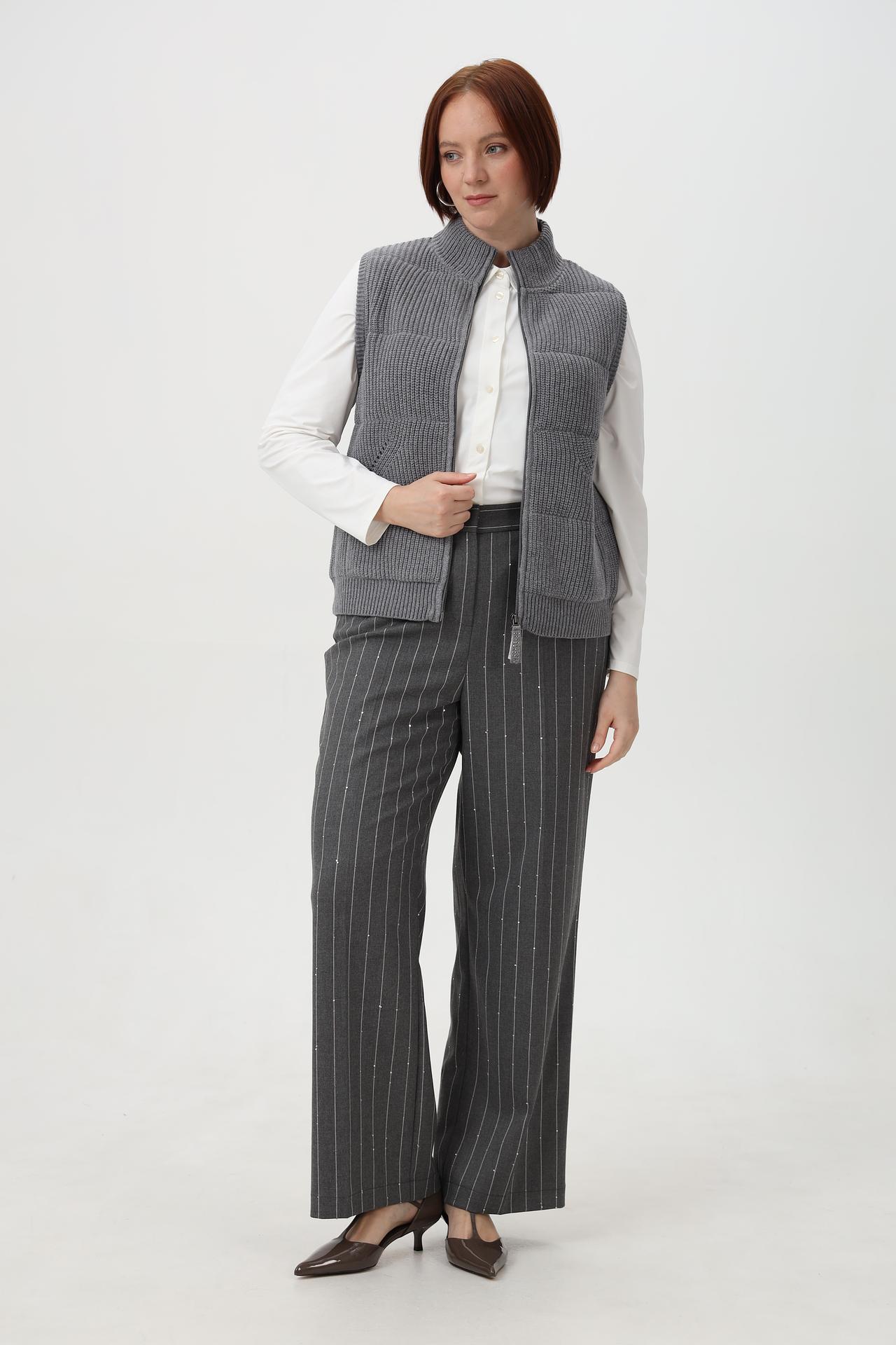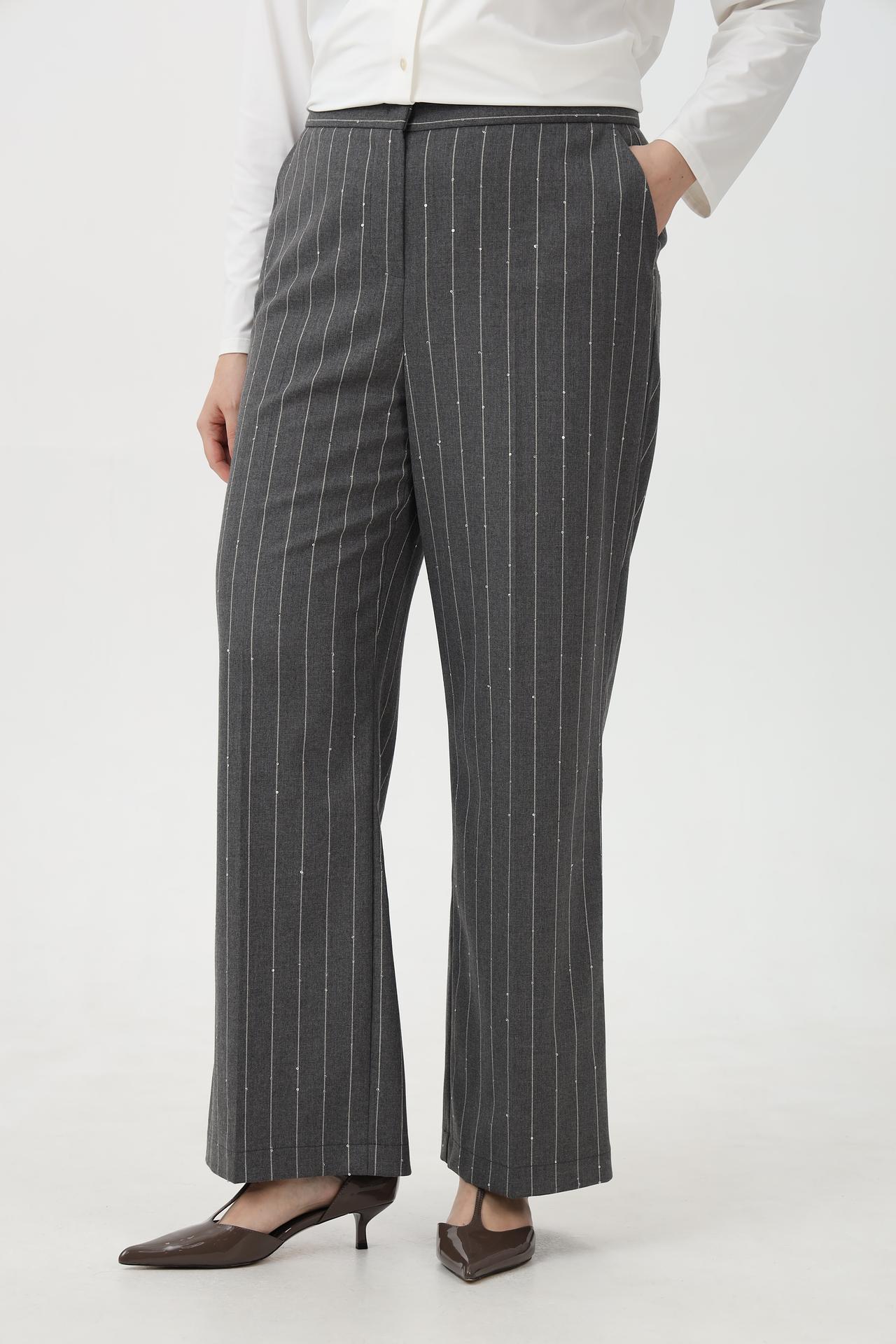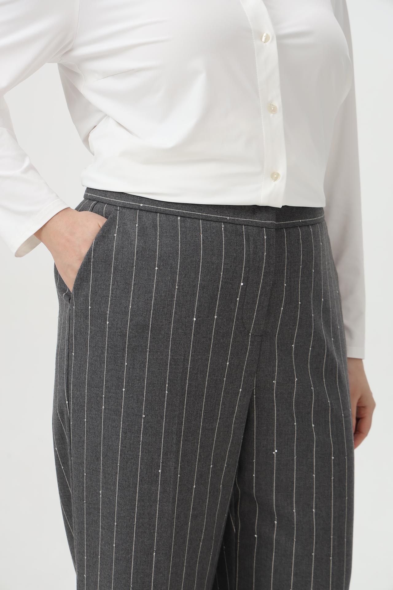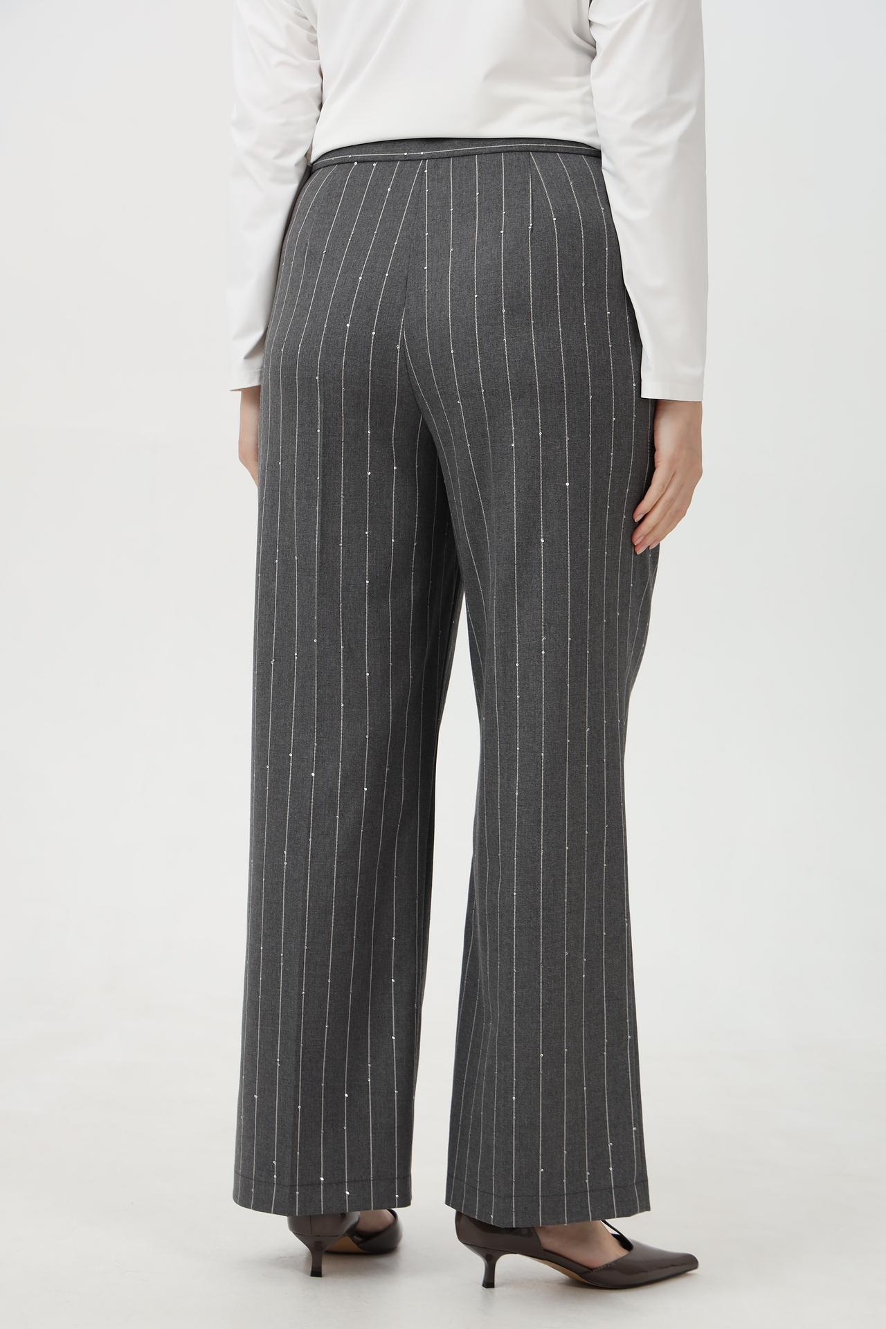 - Дизайн и отделка: Классическая модель в полоску дополнена сверкающими пайетками, которые придают брюкам праздничный и элегантный вид. Это делает их универсальными для деловых и вечерних образов.