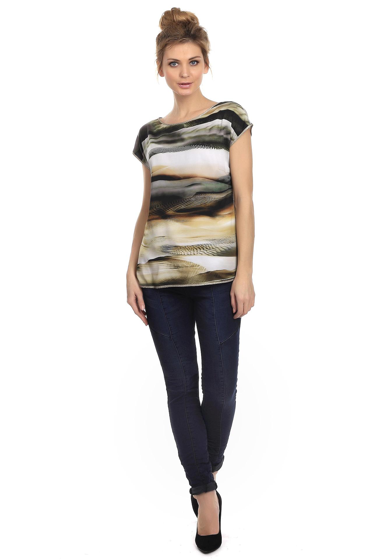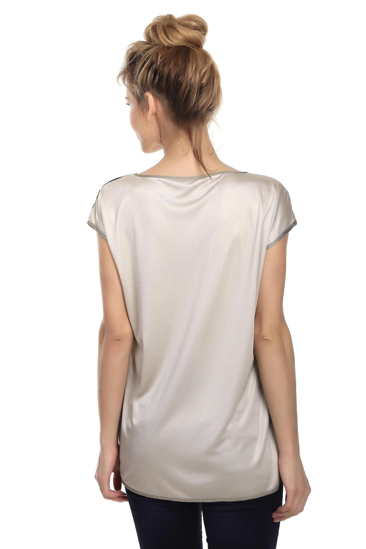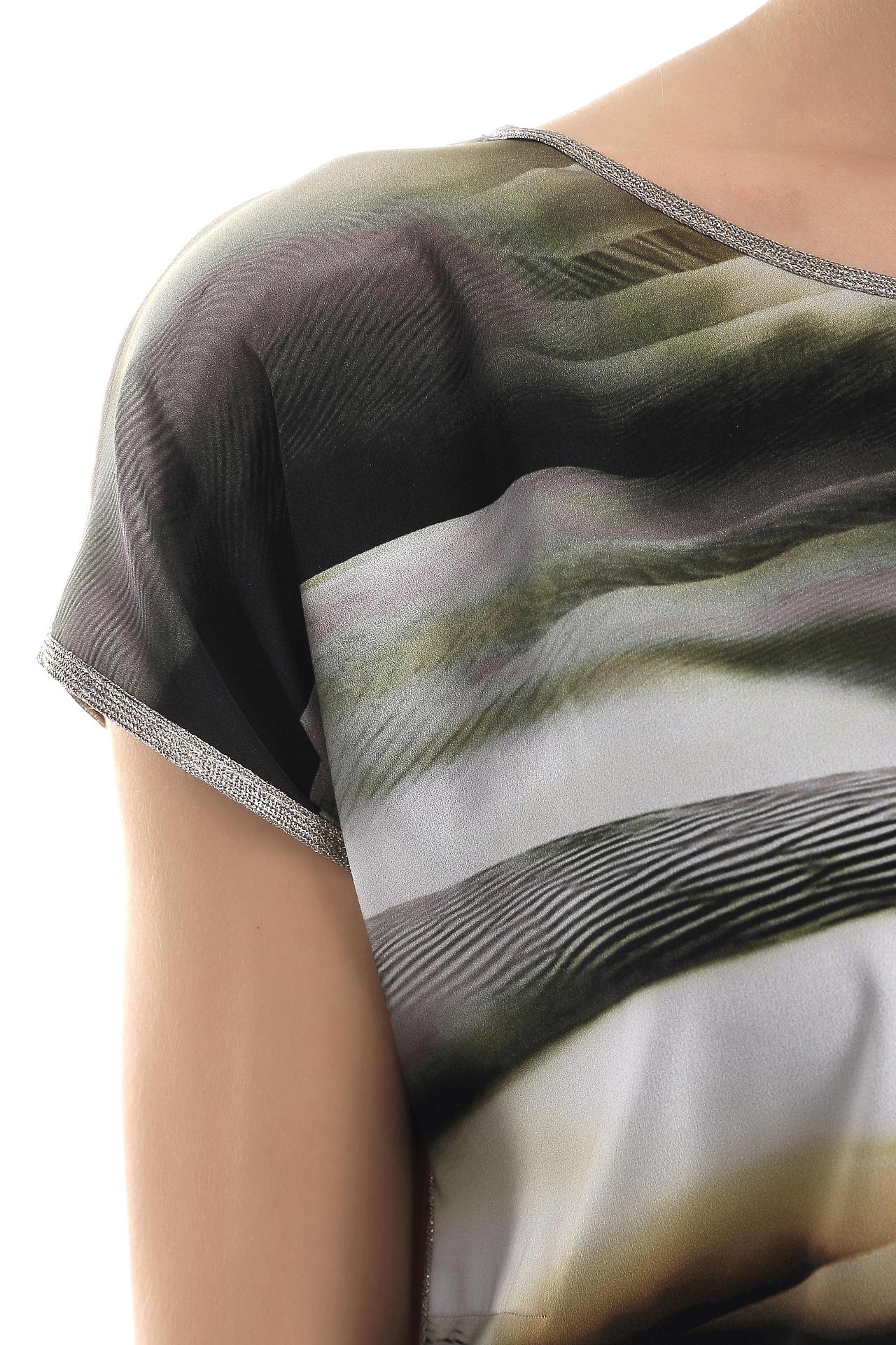 - Дизайн: Оригинальный абстрактный принт с имитацией природных пейзажей придает блузе неповторимый шарм. Серебристая отделка по краю горловины и рукавов добавляет изысканности.
