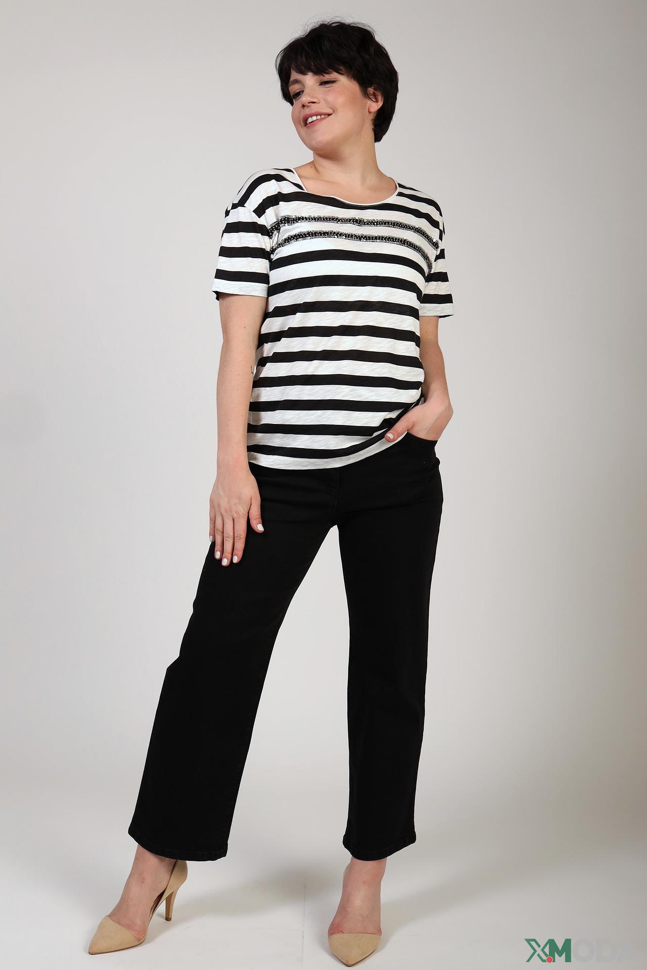- Дизайн и принт: Классический горизонтальный полосатый принт в контрастных черном и белом цветах. Такой дизайн является универсальным и всегда актуальным, позволяя легко комбинировать футболку с брюками, джинсами или юбками.
