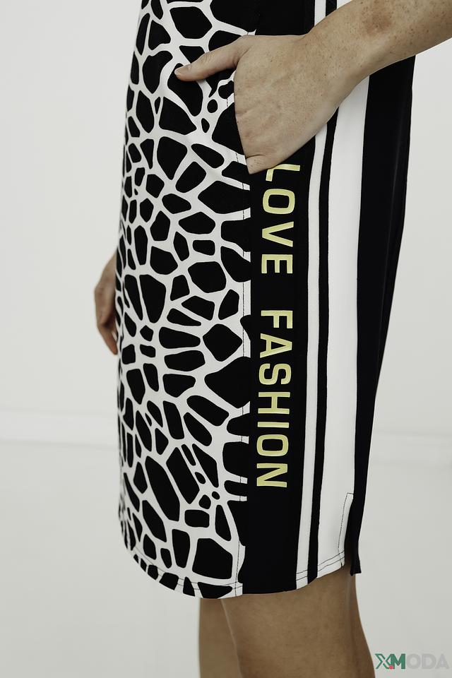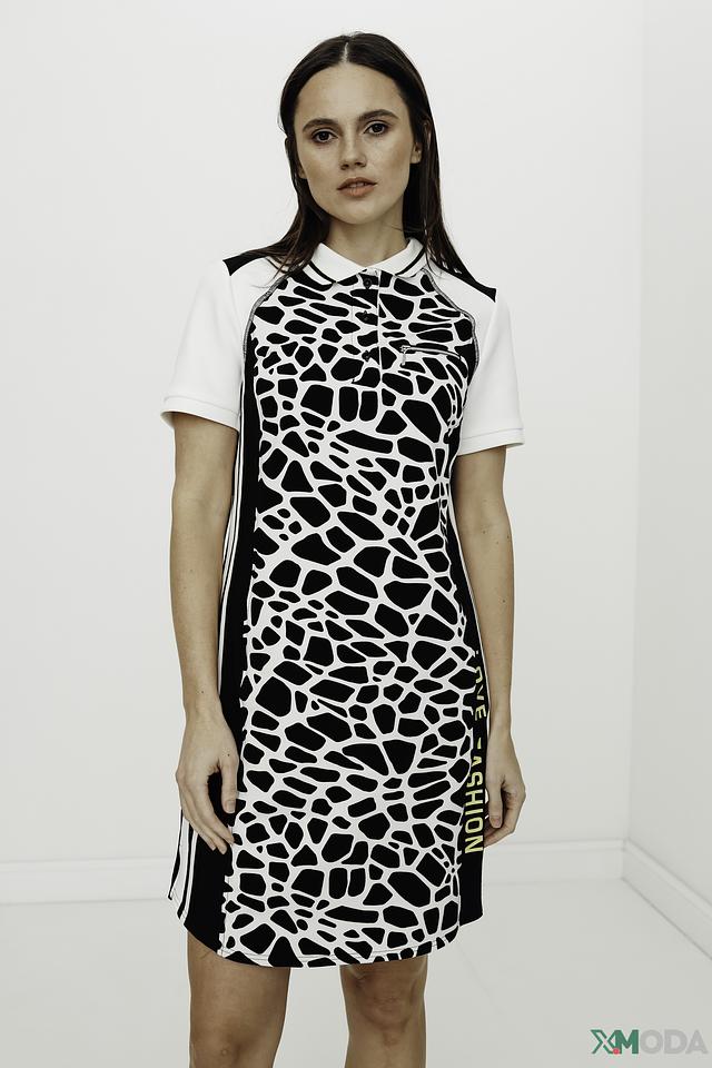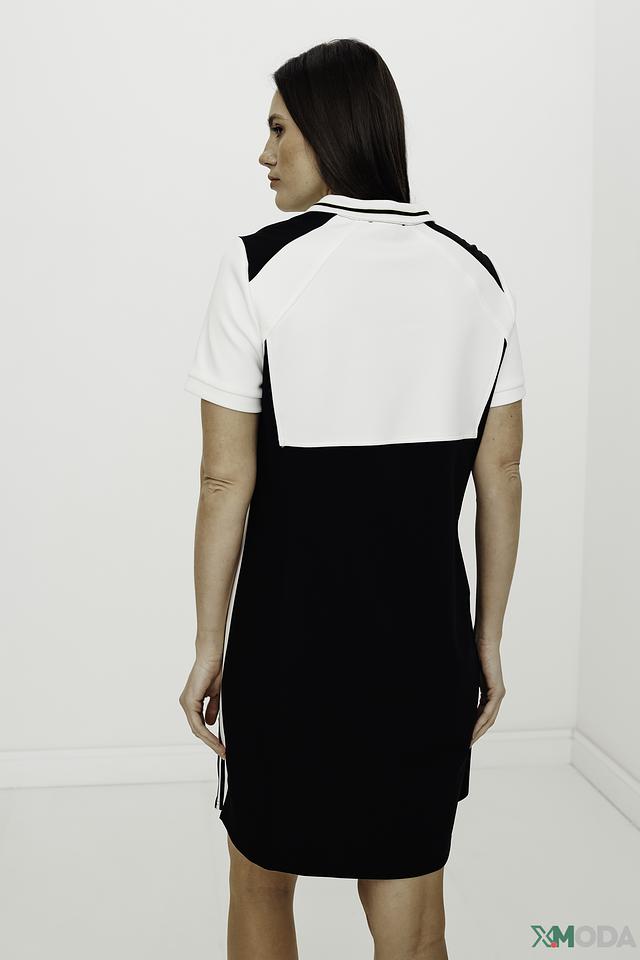 Платье имеет короткие рукава и воротник-стойку, что придает ему современный и динамичный вид. Декоративные черные полосы по бокам визуально стройнят фигуру. Застежка-молния расположена на спине, обеспечивая удобство при надевании.