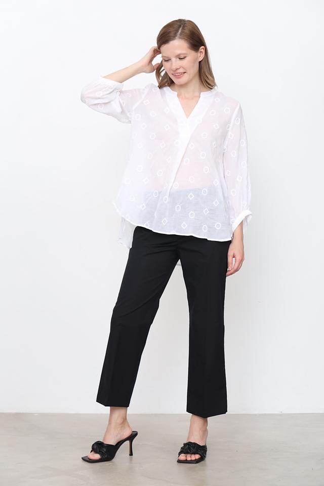 Брюки имеют прямой крой, который обеспечивает комфортную посадку и свободу движений. Изготовлены из высококачественного хлопка с добавлением эластана, что придает им мягкость и эластичность. Благодаря этому, брюки хорошо держат форму и не мнутся.