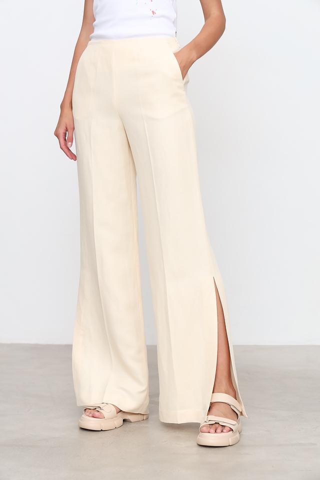 Брюки имеют широкий крой палаццо, который визуально удлиняет ноги и придает образу легкость. Разрезы по бокам добавляют динамики и оригинальности. Высокая посадка подчеркивает талию и создает элетный силуэт.