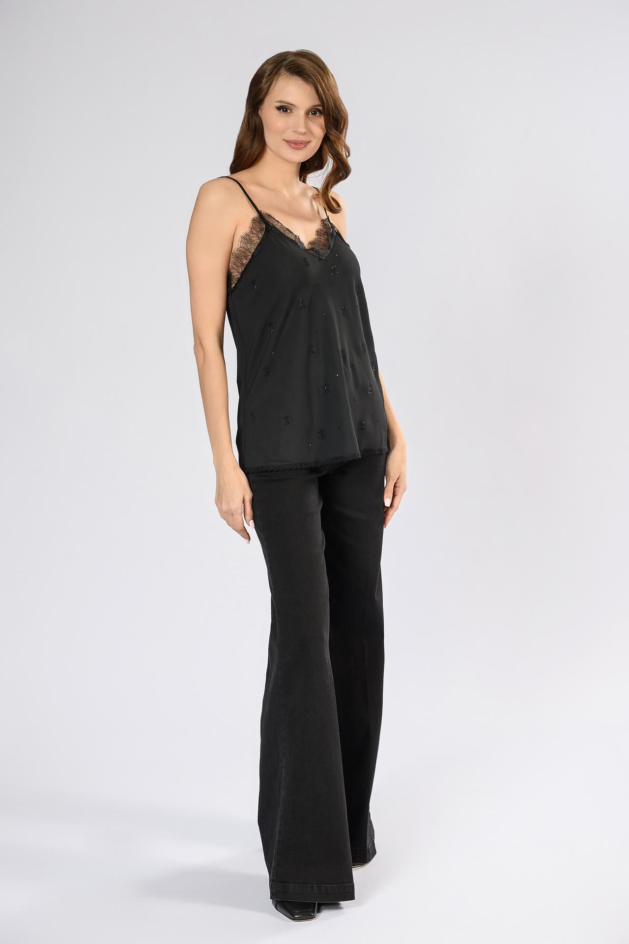 Элегантный черный топ Twin Set — идеальный выбор для создания утонченного образа. Изысканное кружево по V-образному вырезу и нижней кромке добавляет изделию женственности и шарма. Оригинальный принт в виде логотипов бренда, усыпанных мелкими блестками, придает топу эксклюзивность.