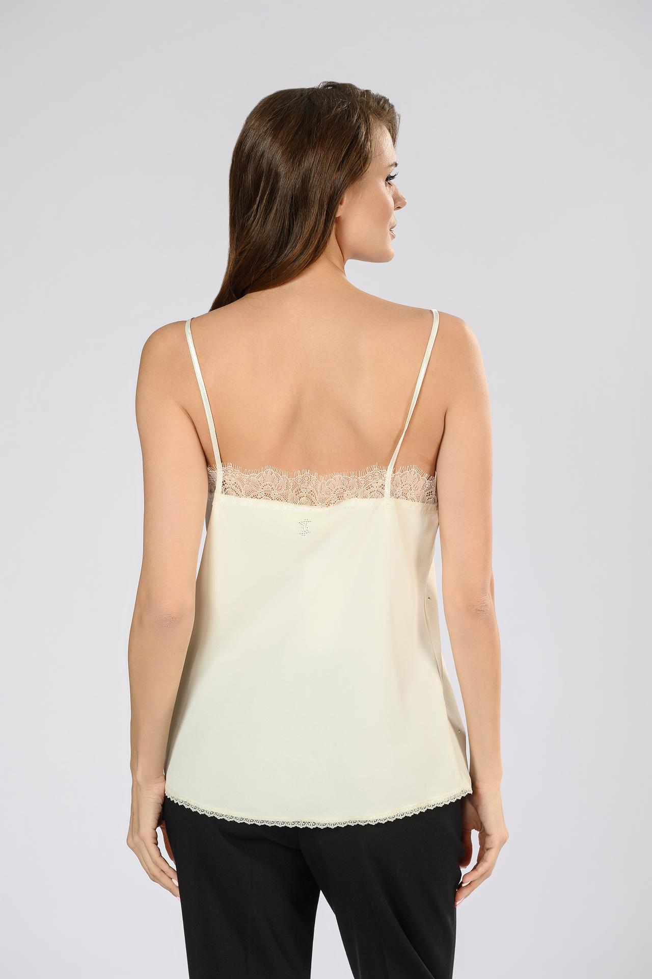 - Кружевные детали: Деликатное кружево по краю топа добавляет нотку романтики и женственности.