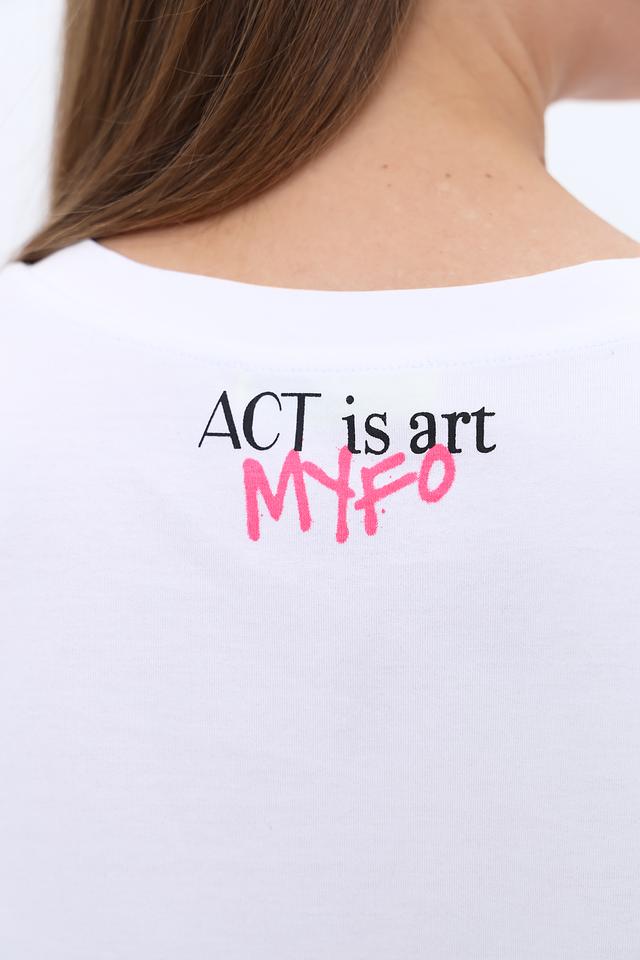 Основным элементом дизайна является крупный принт в виде розового медведя, выполненный в графичном стиле с элементами "брызг" краски. На спине футболки расположен небольшой логотип бренда и надпись "ACT is art".
