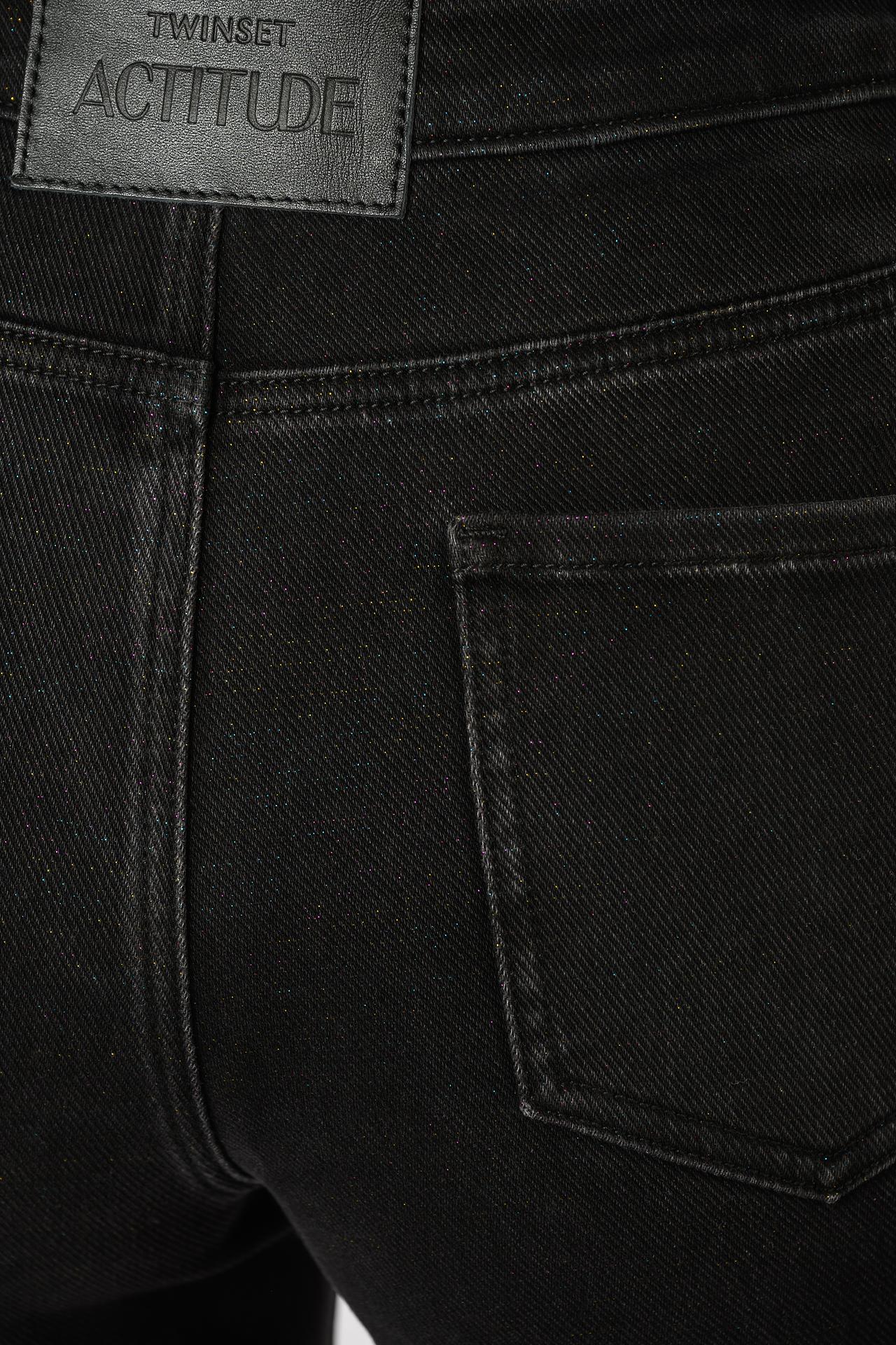 Расклешенные джинсы от Twin Set – идеальный выбор для создания стильных и современных образов. Благодаря уникальному сочетанию материалов, они обеспечивают комфорт и превосходную посадку по фигуре. Модель выполнена в классическом черном цвете с добавлением мелких блесток, которые придают изделию особую изысканность и мерцание при движении. Джинсы прекрасно подойдут как для повседневного гардероба, так и для вечерних выходов.