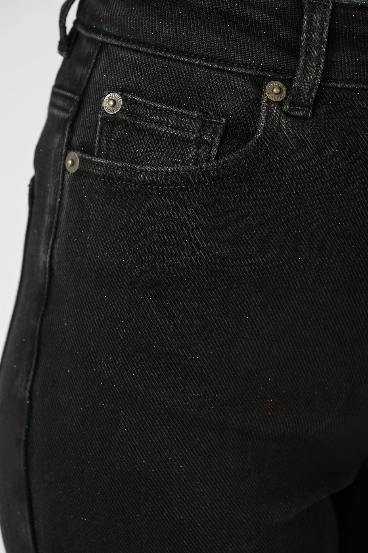 - Цвет: Насыщенный черный цвет с мерцающими вкраплениями делает эти джинсы универсальными и легко сочетаемыми с различной одеждой.