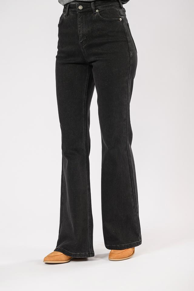 Джинсы имеют высокую посадку, которая визуально удлиняет ноги и подчеркивает талию. Клеш от колена придает образу ретро-шарм и делает силуэт более сбалансированным. Ткань джинсов состоит из хлопка, полиэстера и небольшого количества эластана, что обеспечивает комфорт при носке и хорошую посадку по фигуре.