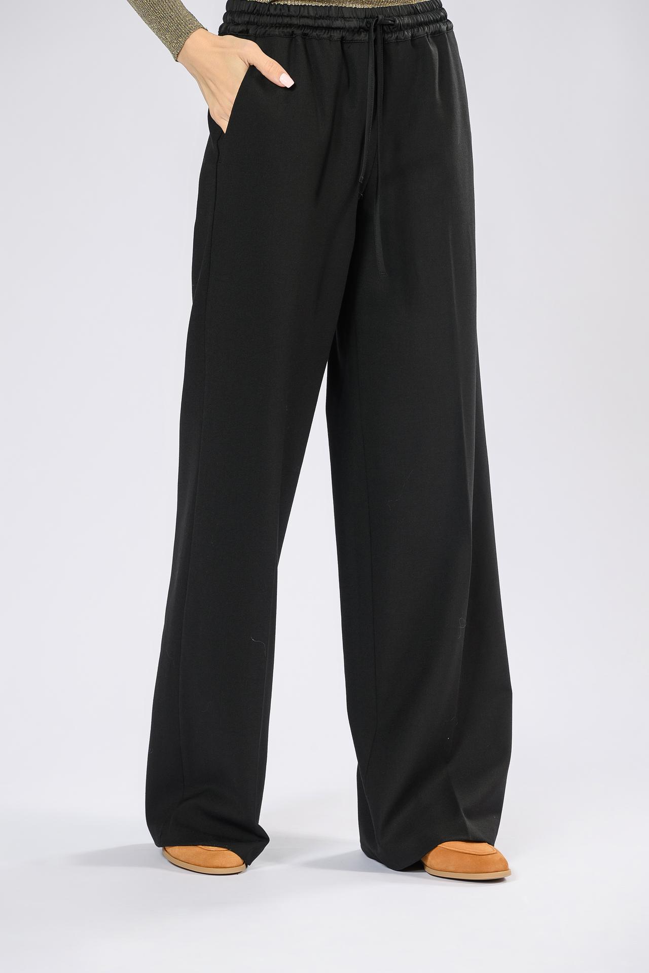 - Дизайн и крой: Широкие брюки прямого кроя с эластичным поясом на кулиске создают расслабленный, но элегантный силуэт. Боковые карманы добавляют функциональности.