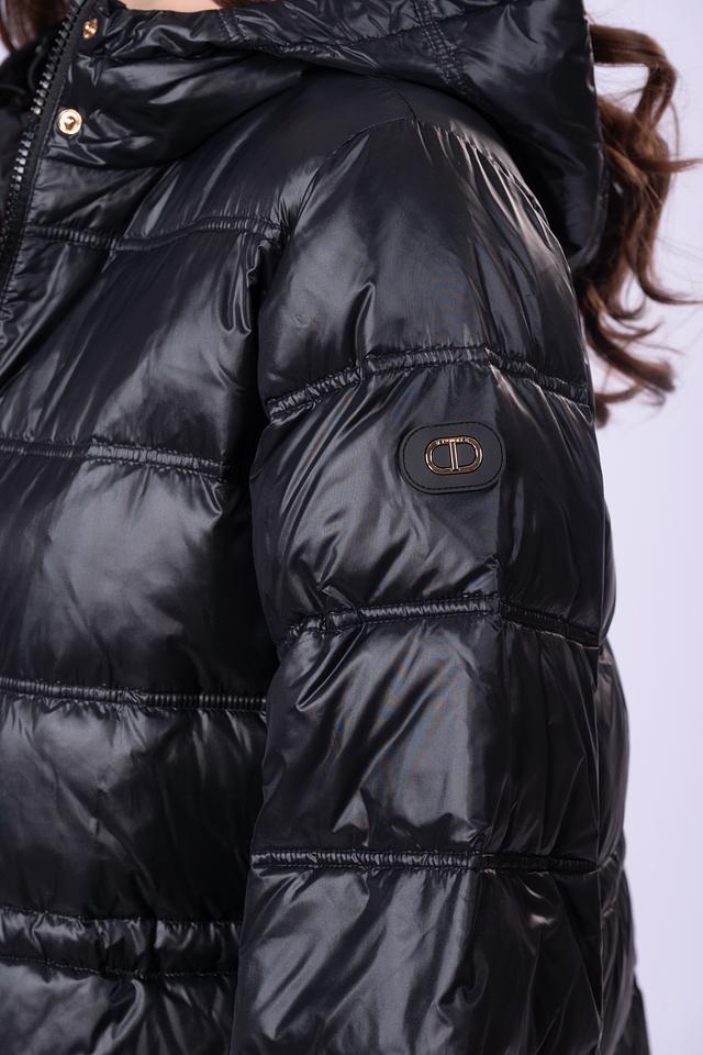 Чёрное стеганое пальто Twin Set – это стильное и теплое решение для прохладной погоды. Модель имеет капюшон, пояс и удобные манжеты на рукавах, что обеспечивает комфорт и защиту от ветра. Состав: полиамид 100%