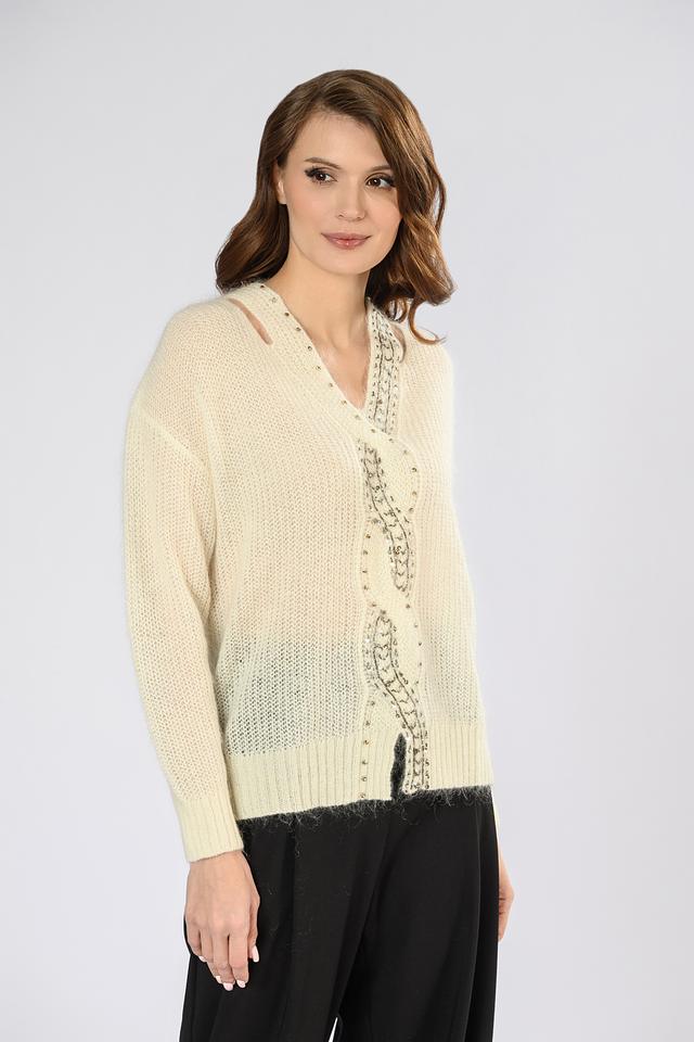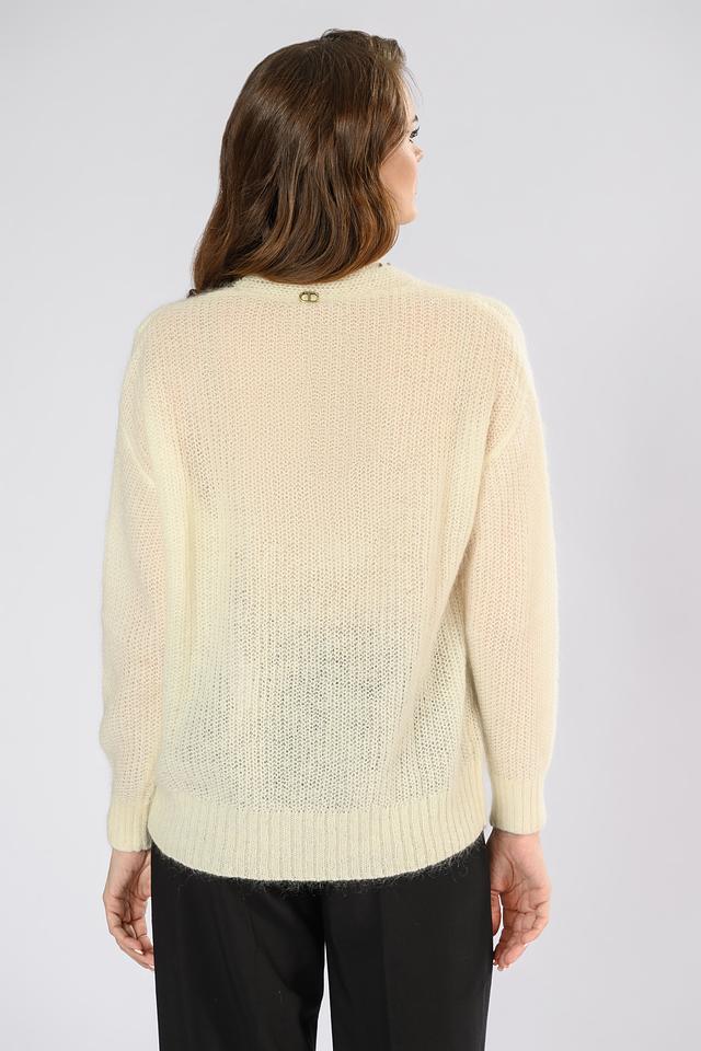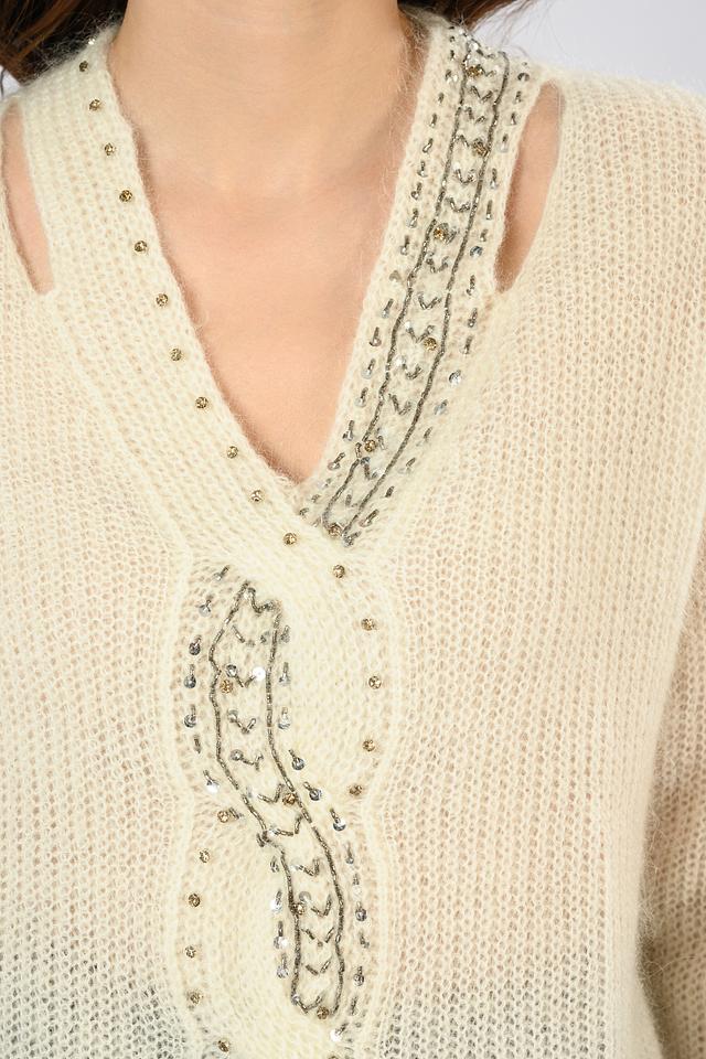 Бежевый джемпер от Twin Set с V-образным вырезом и деликатной вышивкой. Модель выполнена из мягкой смеси шерсти, мохера и полиамида, что обеспечивает комфорт и тепло. Состав: полиамид 40%, шерсть 30%, мохер 30%