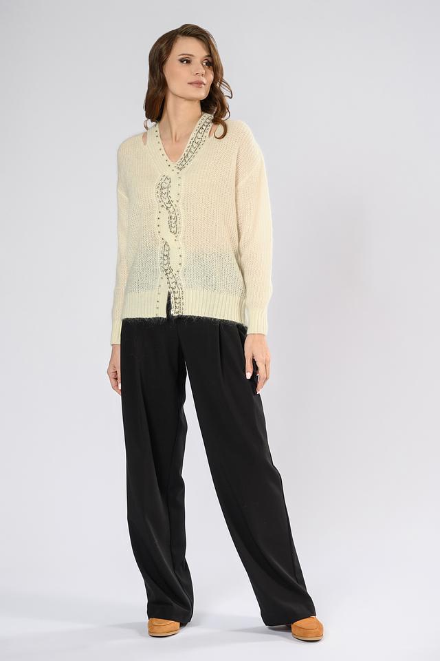 Джемпер имеет V-образный вырез, который подчеркивает линию шеи, и слегка свободный крой, обеспечивающий комфортную посадку. Рукава джемпера длинные, а низ отделан ажурным вязанием.