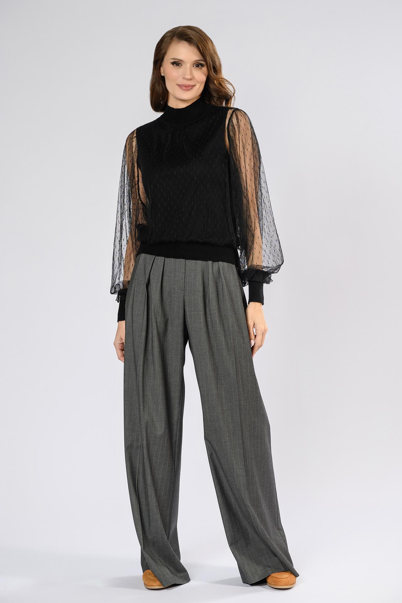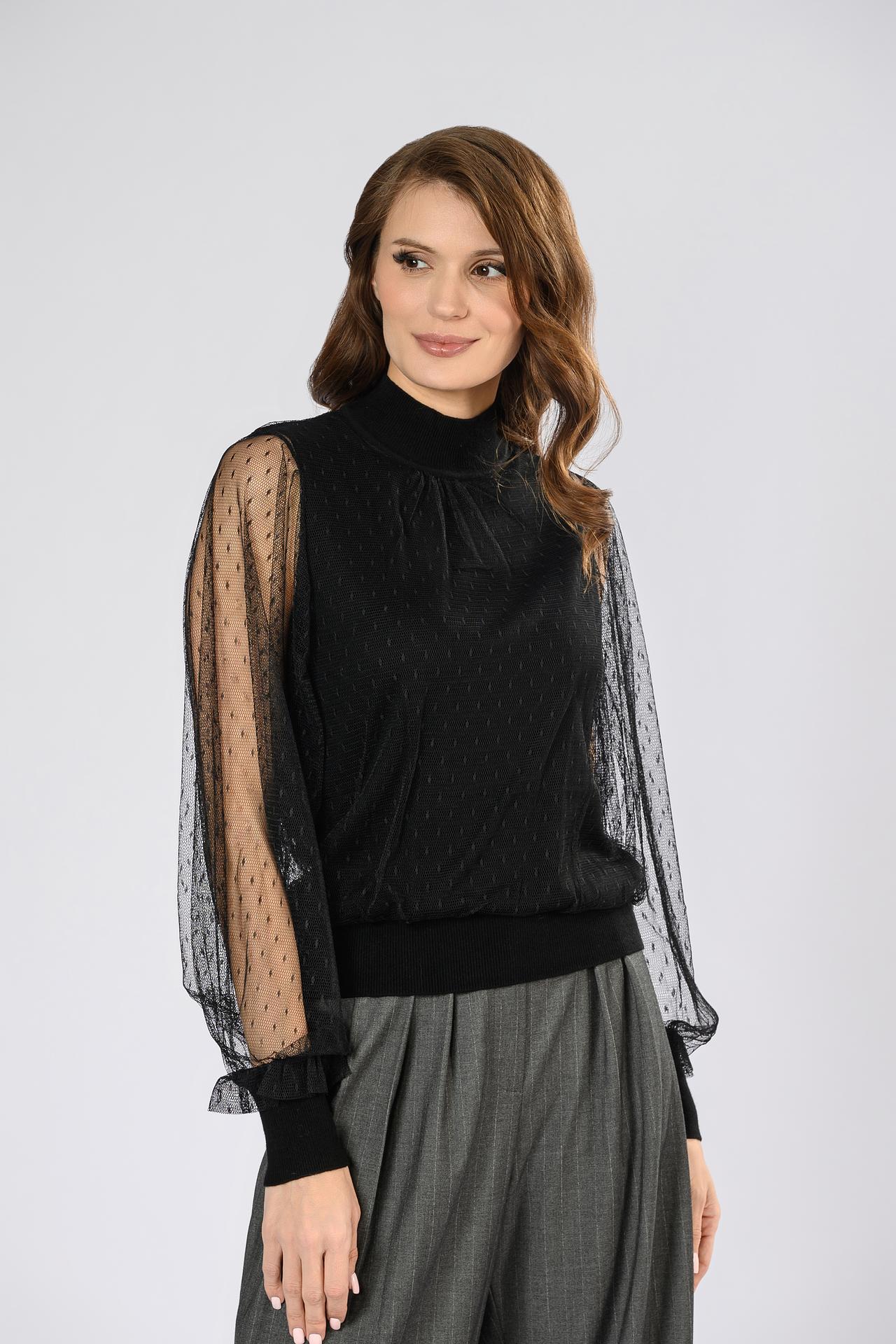 - Дизайн: Эффектные объемные рукава из полупрозрачной ткани с фактурным узором создают романтичный и модный силуэт. Высокий воротник-стойка и манжеты добавляют изящества.