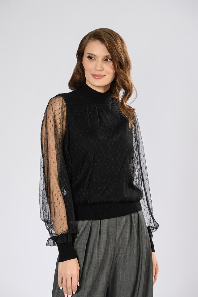 Особенностью данного джемпера являются рукава-фонарики, выполненные из полупрозрачной ткани в мелкий горошек. Этот элемент придает изделию лёгкость и романтичность. Основная часть джемпера выполнена из мягкой и приятной к телу ткани, в состав которой входит вискоза, полиамид, шерсть и кашемир.