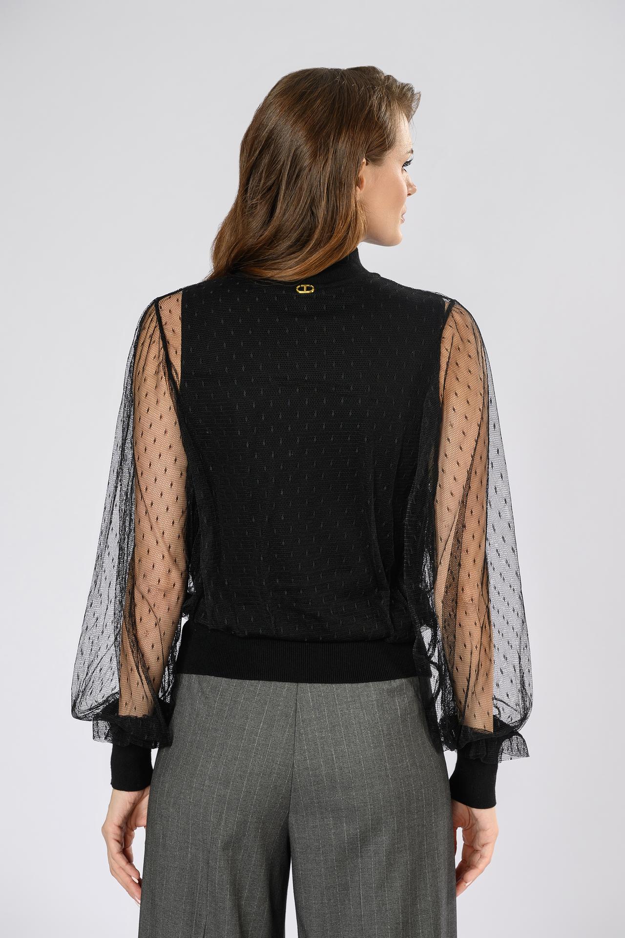 Элегантный джемпер от Twin Set – идеальное дополнение к вашему гардеробу. Модель выполнена из высококачественных материалов, обеспечивая комфорт и изысканный вид. Прозрачные объемные рукава с мелким узором добавляют образу утонченности и женственности. Классический черный цвет делает джемпер универсальным, позволяя сочетать его с различными элементами одежды.