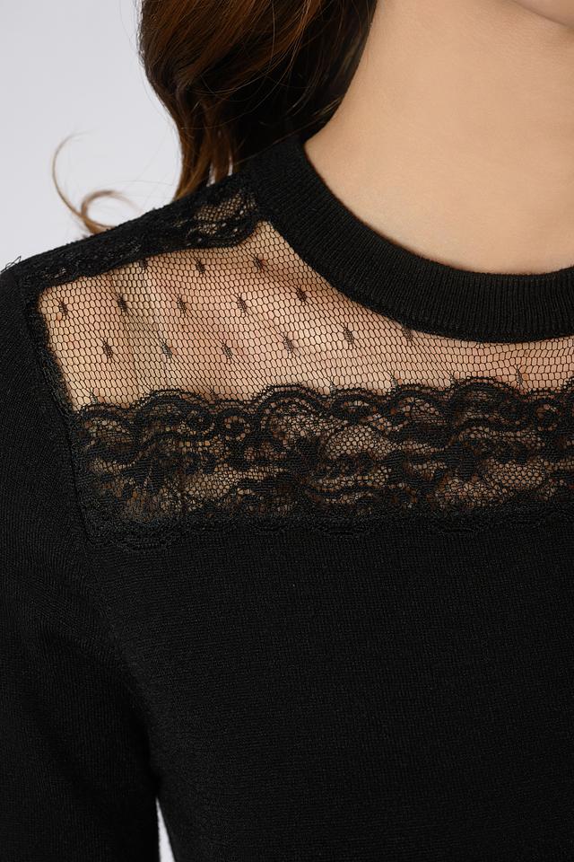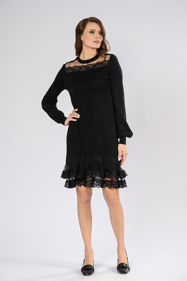 Особенностью модели является деликатная отделка из кружева на горловине и по нижнему краю, придающая образу романтичность и изысканность. Длинные рукава делают платье подходящим для прохладной погоды.