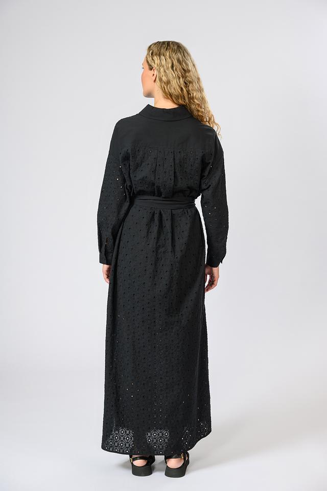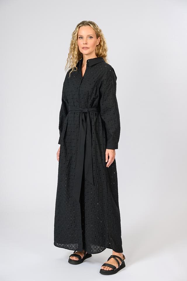 Платье имеет длину макси, длинные рукава и V-образный вырез. Особый шарм изделию придает ажурный рисунок, покрывающий всю поверхность ткани. Модель дополнена поясом, который позволяет подчеркнуть талию и создать более женственный силуэт.