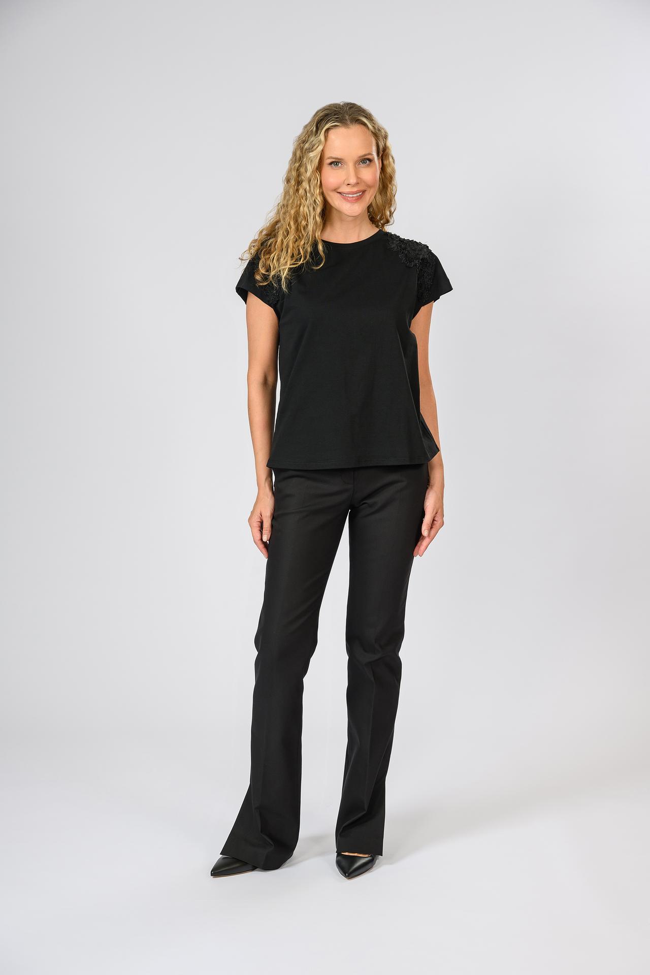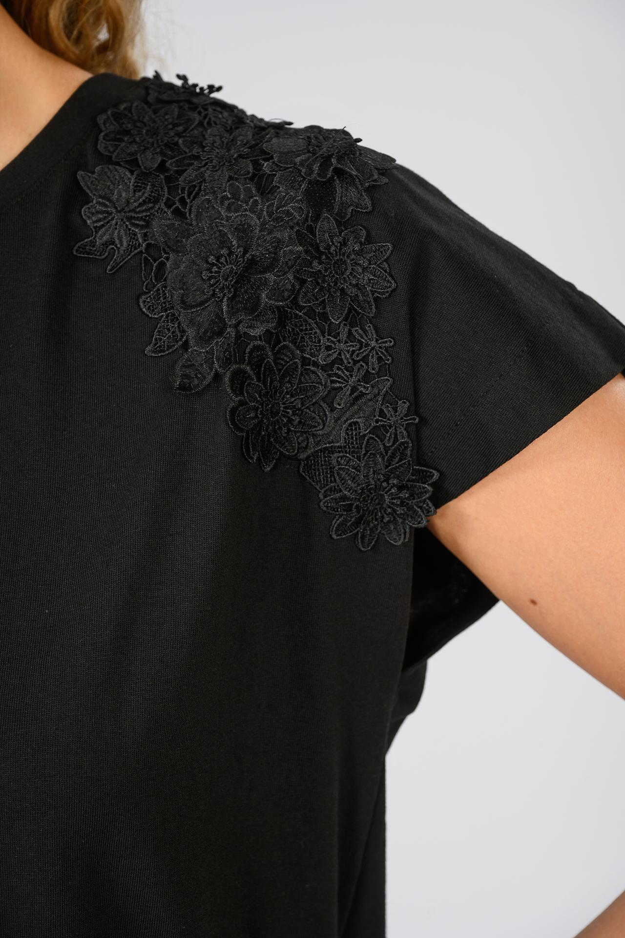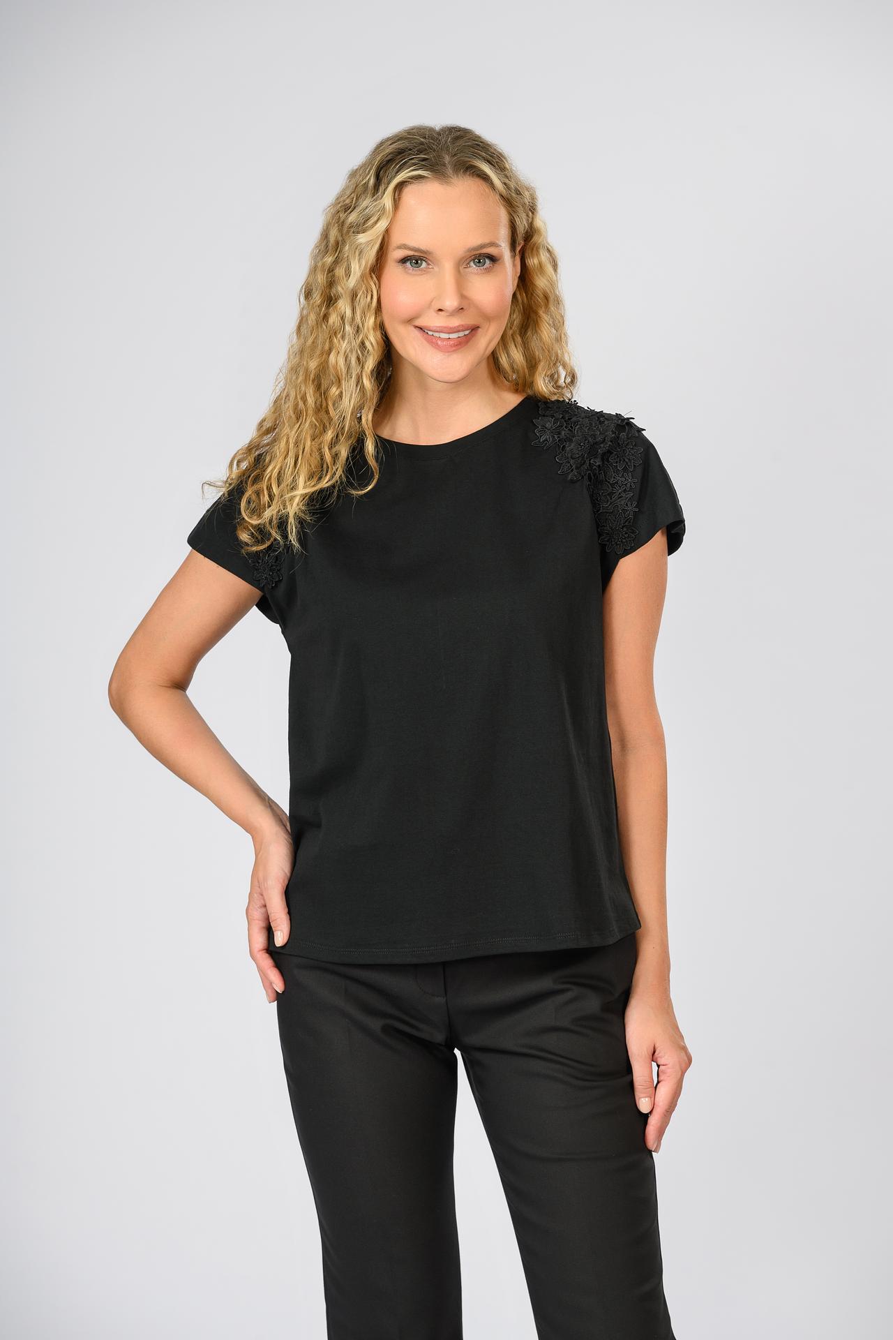 - Дизайн: Классический прямой крой и круглый вырез горловины. Дополнен элегантной кружевной отделкой на плечах в виде объемных цветов, создающей акцент.