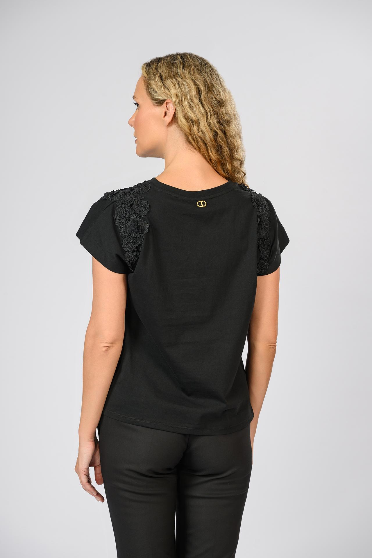 Элегантная блуза от Twin Set — идеальное дополнение к вашему гардеробу. Выполненная из 100% хлопка, она обеспечивает комфорт и воздухопроницаемость в течение всего дня. Лаконичный черный цвет блузы подчеркнут изысканными кружевными аппликациями в виде цветов на плечах, добавляя образу женственности и шарма. Эта модель прекрасно подойдет как для повседневных образов, так и для вечерних выходов, легко сочетаясь с различными элементами одежды.