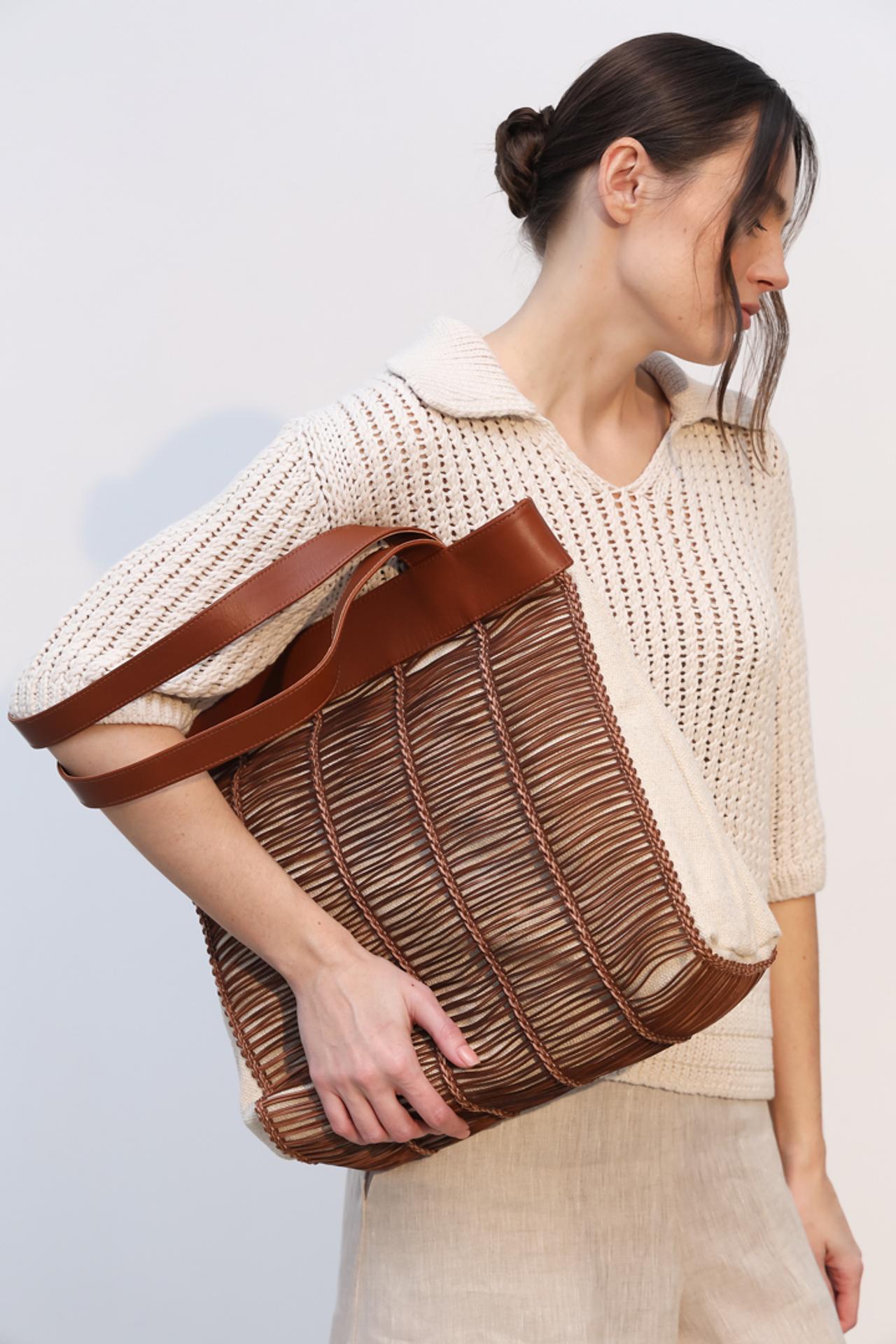 Оригинальный дизайн сумки привлекает внимание. Плетёная структура придает ей неповторимый шарм, а сочетание бежевого и коричневого цветов универсально.