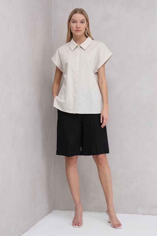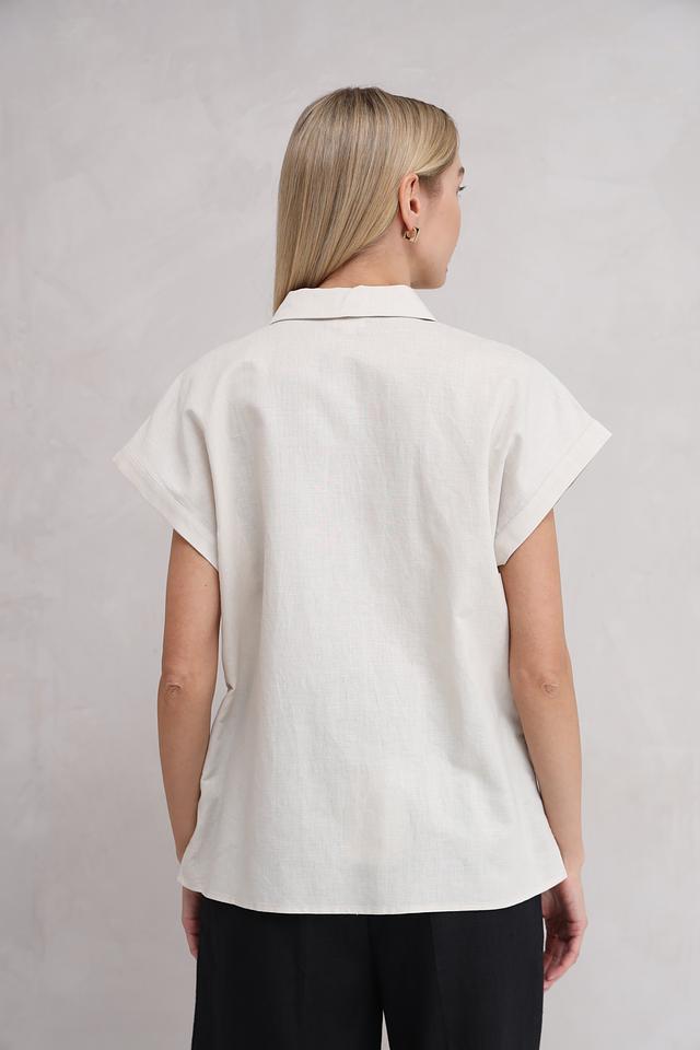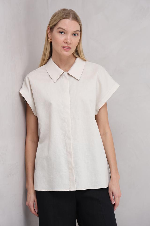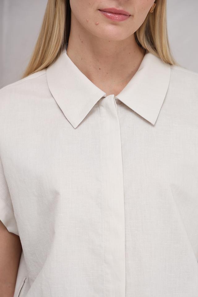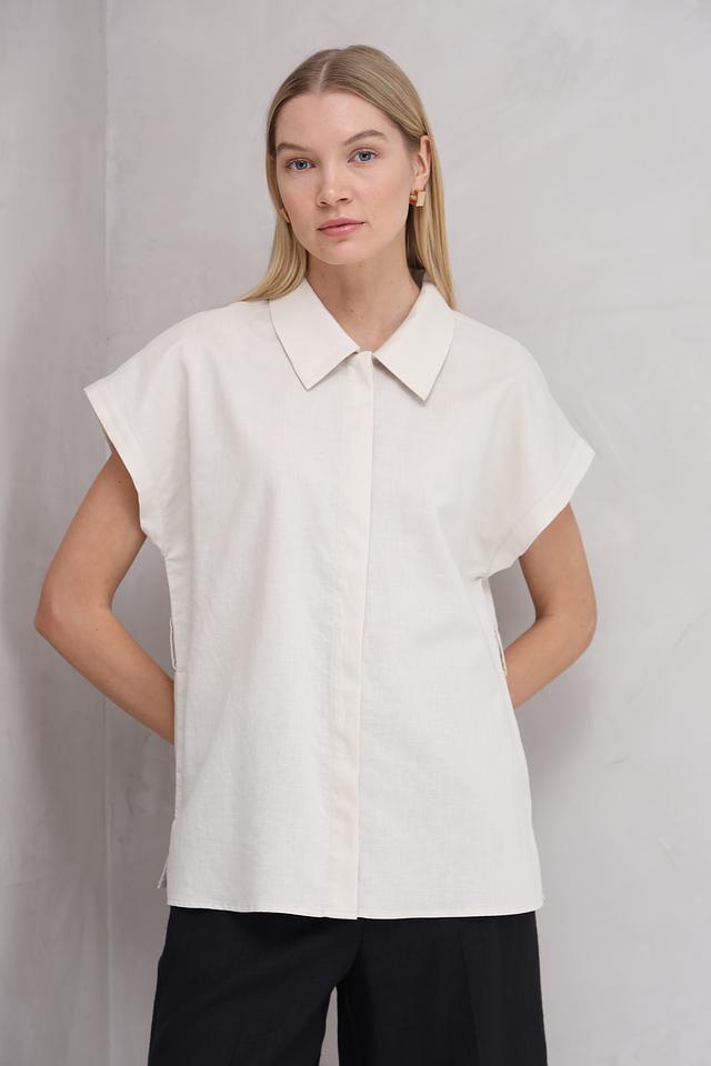 Блуза имеет прямой, слегка свободный крой, который не сковывает движения и позволяет создать расслабленный образ. Короткие рукава делают ее идеальным выбором для теплой погоды. Классический отложной воротник добавляет элегантности.
