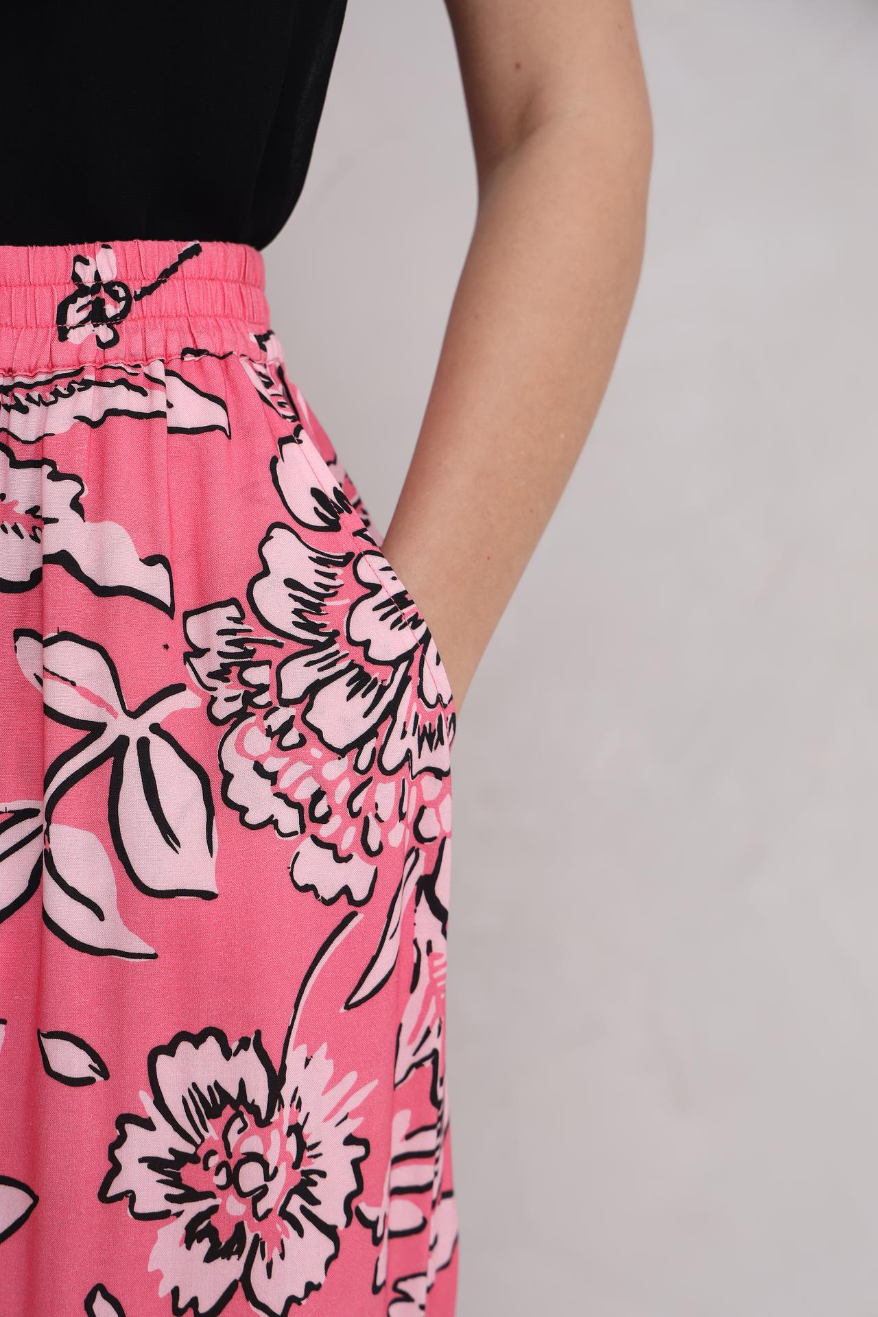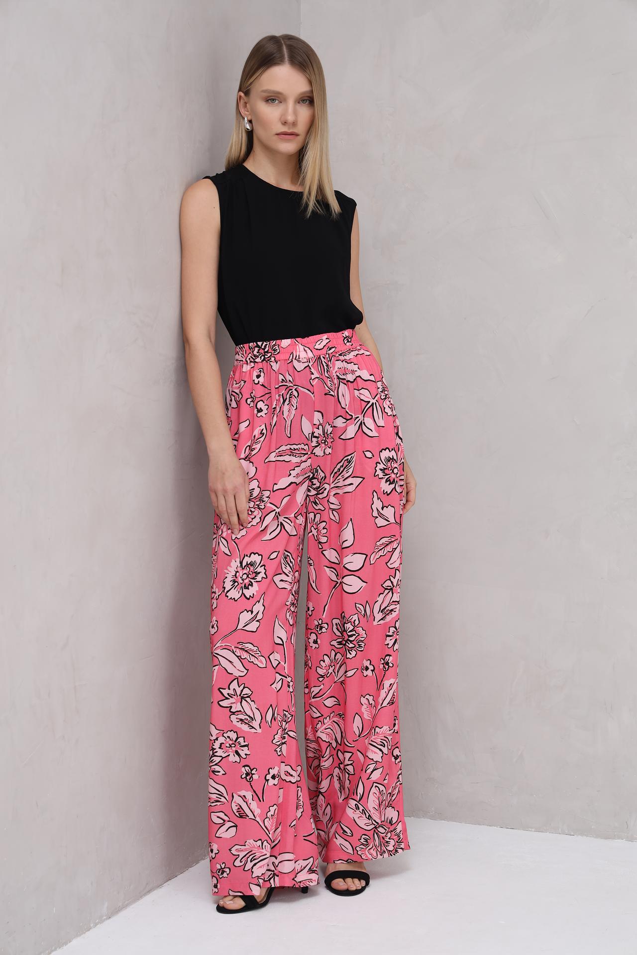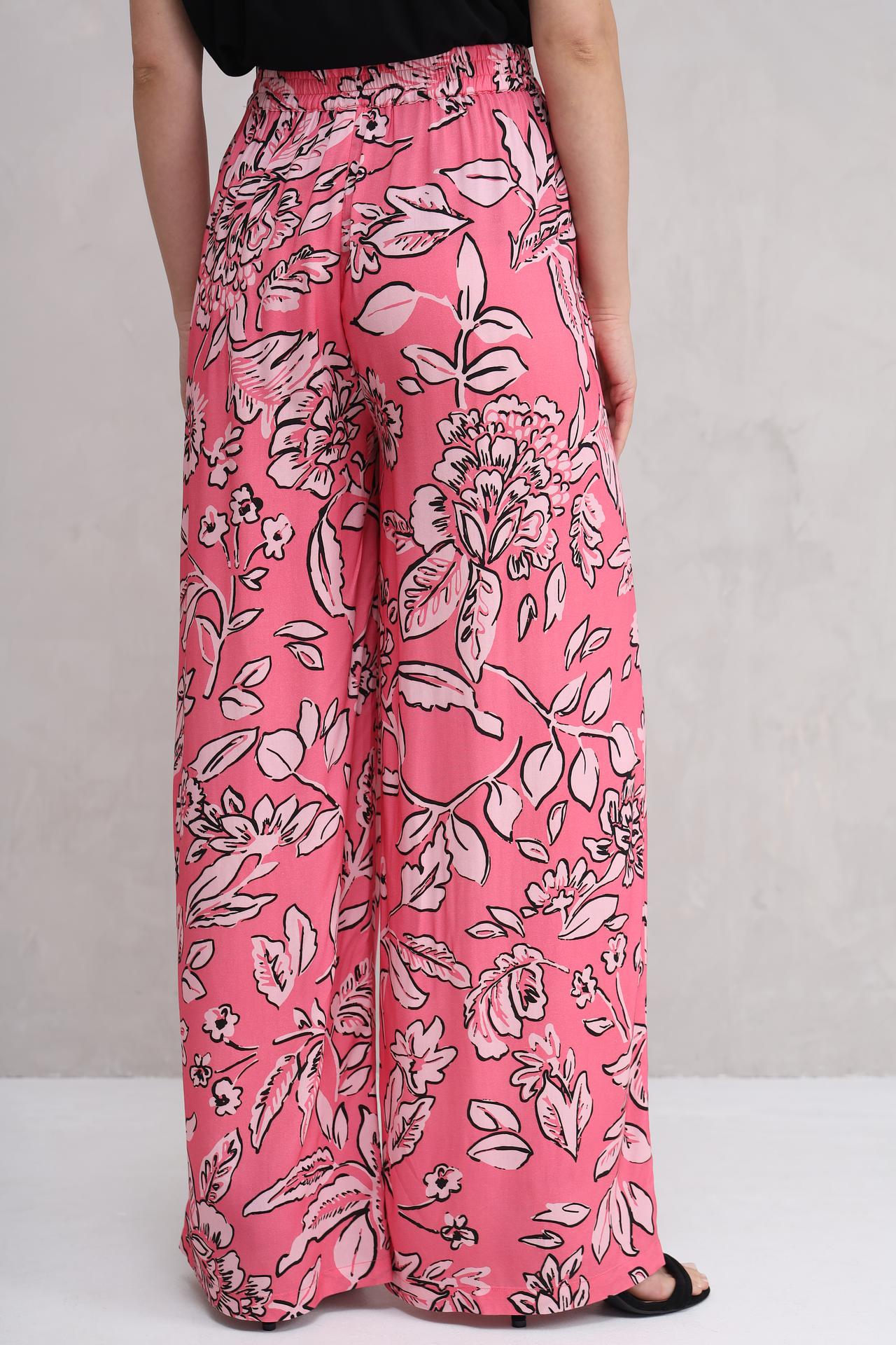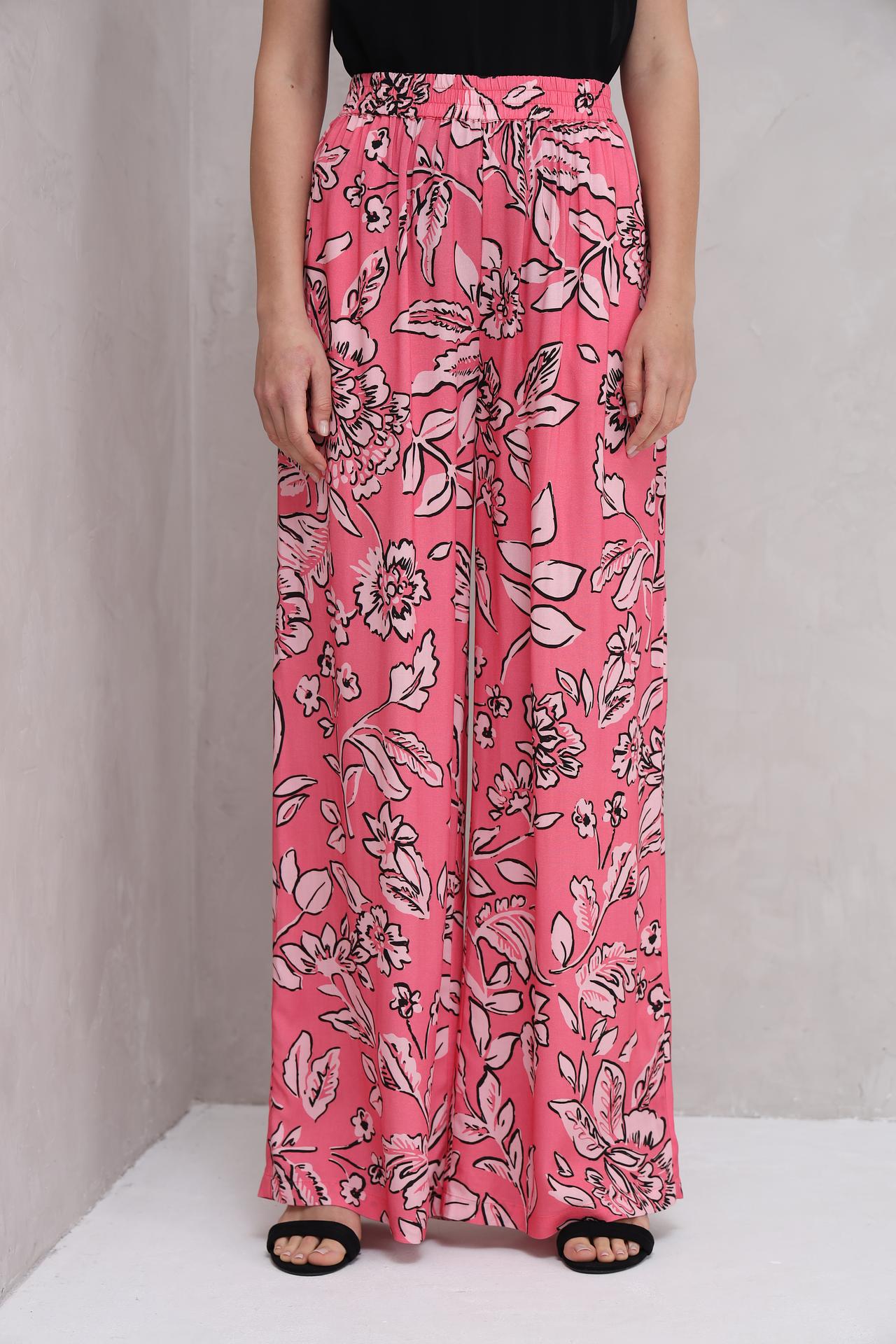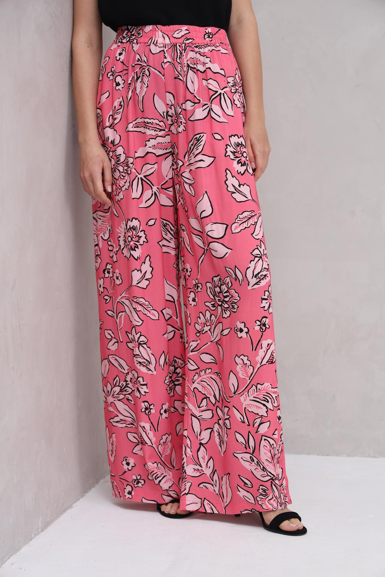 Розовый цветочный принт с черными и светло-розовыми акцентами придает этим летним брюкам уникальный и женственный вид. Свободный крой и эластичный пояс на резинке гарантируют идеальную посадку и свободу движений, делая эти широкие брюки универсальными для повседневной носки и для особых случаев.