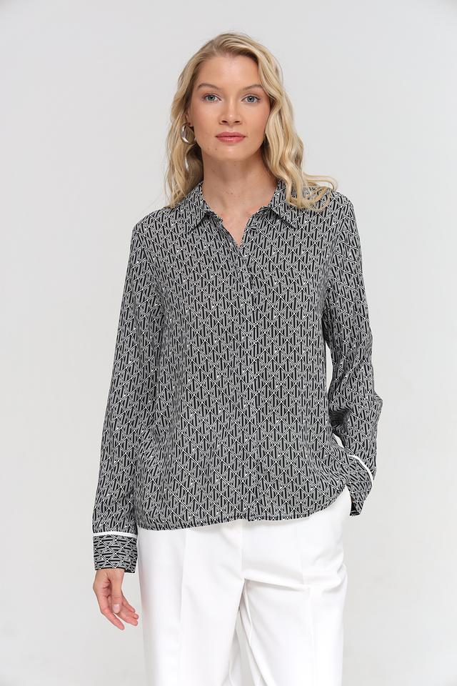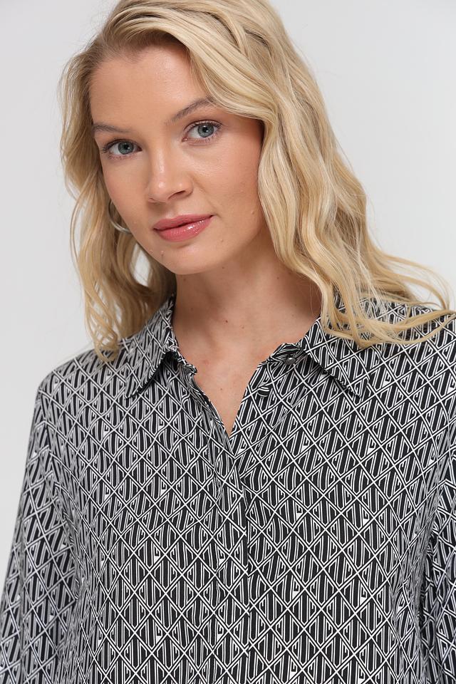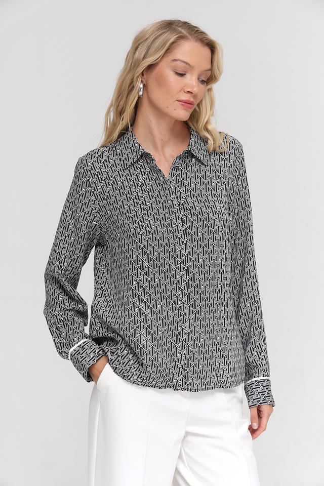 Основной цвет блузы – черный, а ее поверхность украшена геометрическим принтом белого и серого цветов. Принт создает интересный визуальный эффект и добавляет блузе оригинальности.