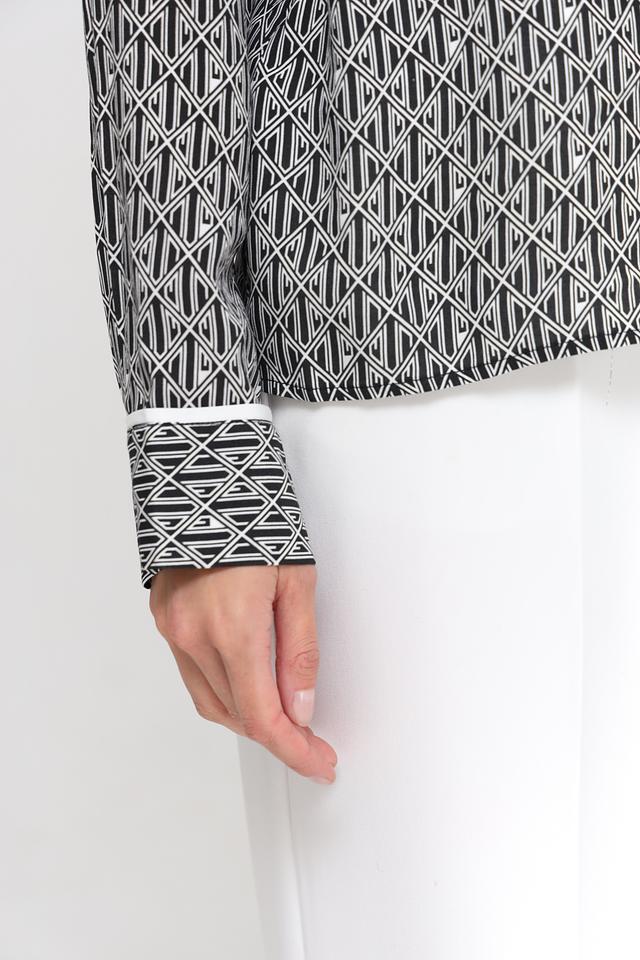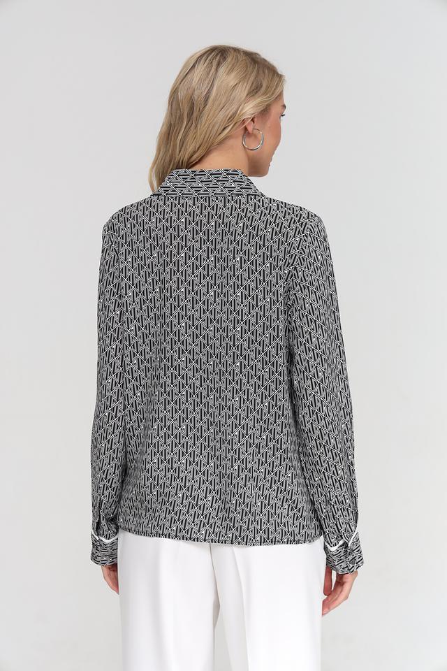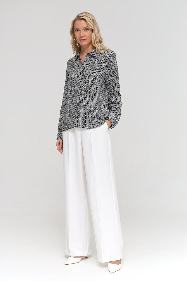 Блуза имеет классический крой с длинными рукавами и отложным воротником. Рукава слегка объемные, с манжетами, украшенными тем же геометрическим принтом, что и вся блуза. Застежка выполнена на пуговицы, что позволяет регулировать степень прилегания.