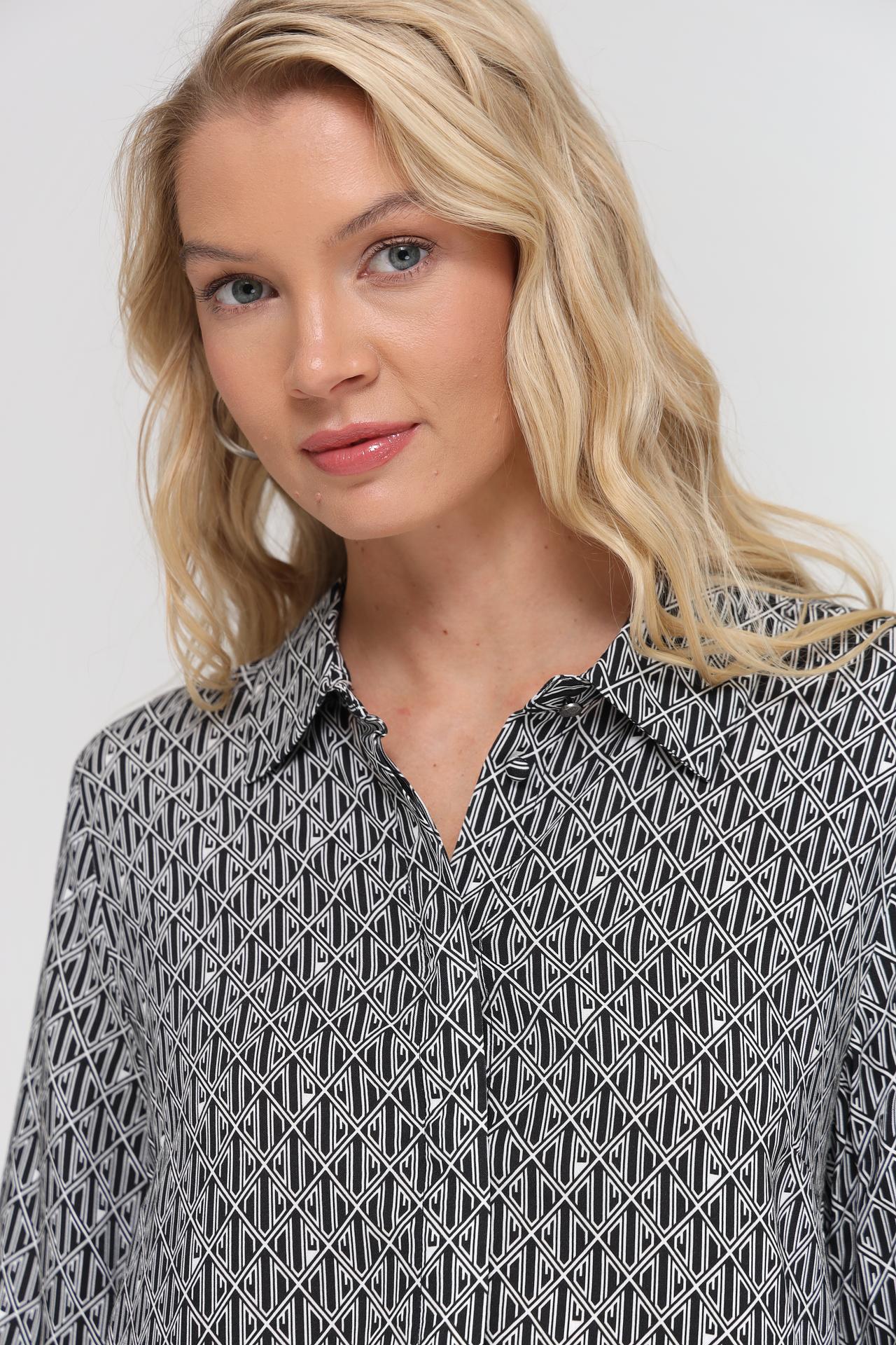 - Дизайн: Модель выполнена в классическом стиле с отложным воротником и длинными рукавами. Оригинальный геометрический принт в черно-белой гамме добавляет образу изюминку.