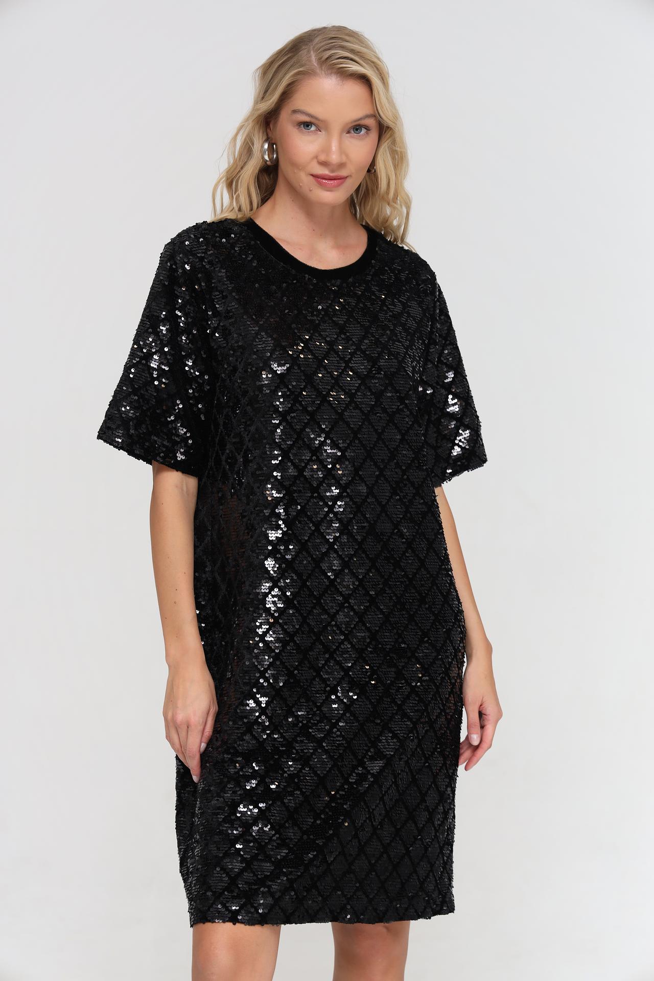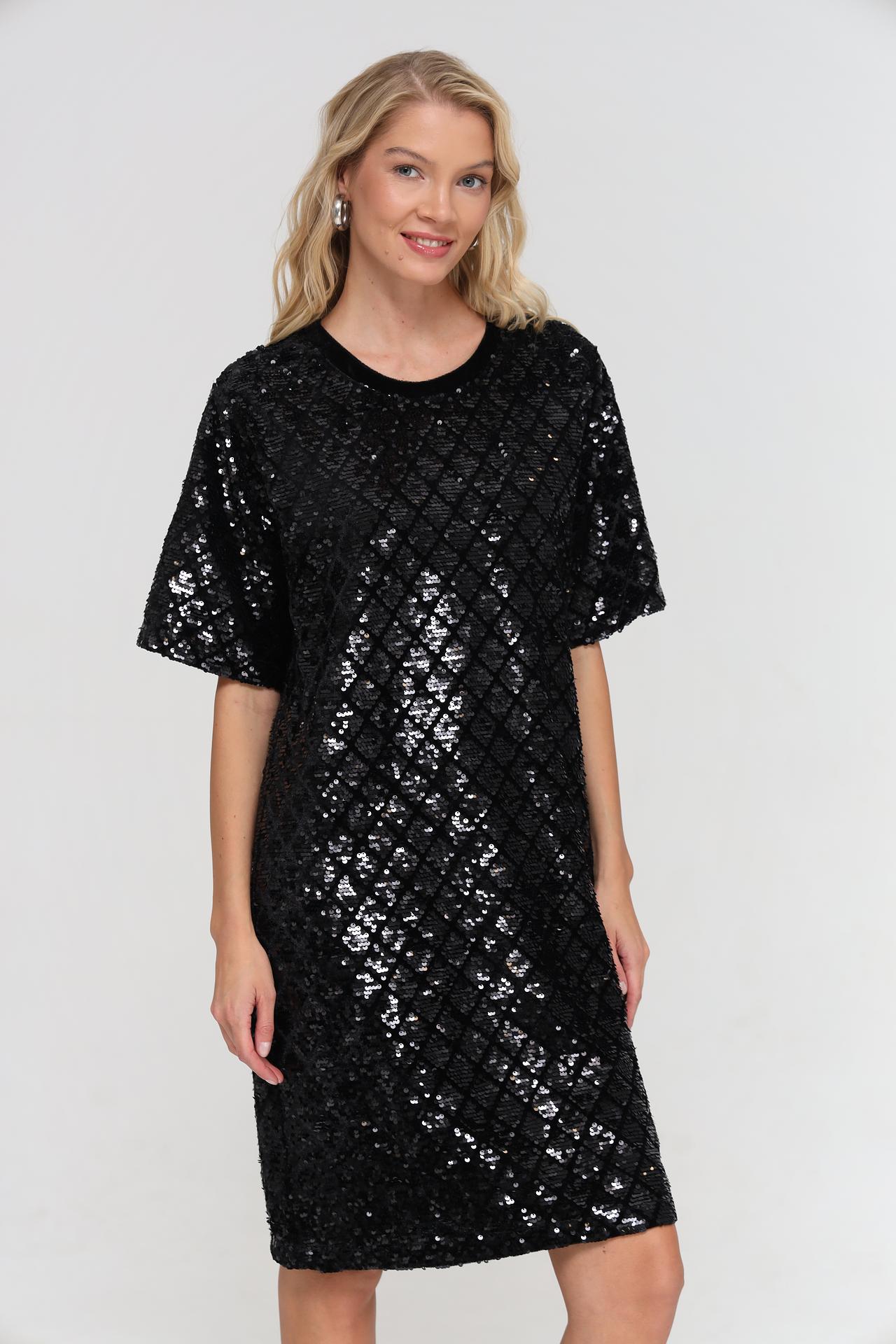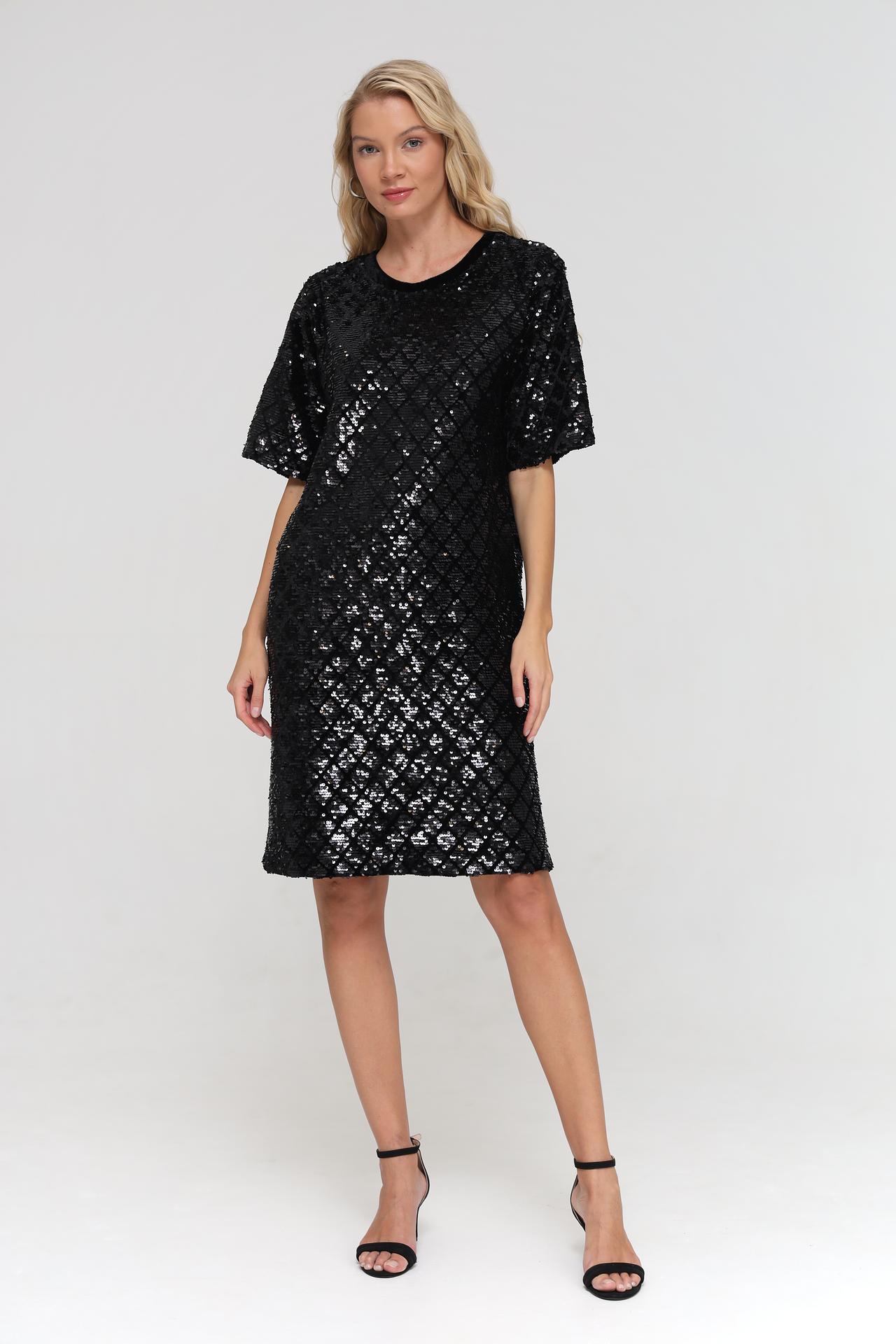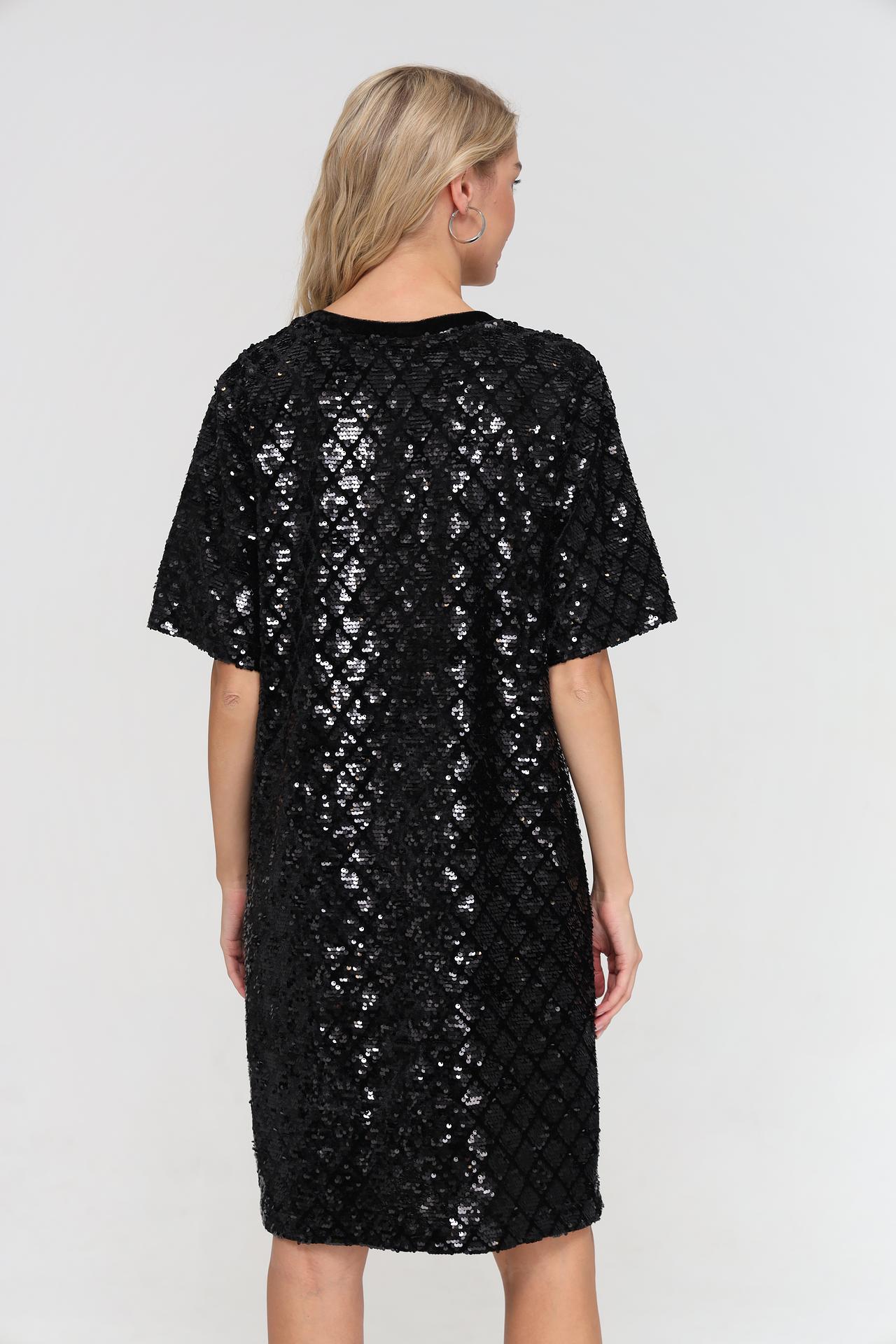 - Дизайн: Платье полностью покрыто переливающимися пайетками, расположенными в виде ромбов. Короткие рукава и прямой крой делают его универсальным и стильным.