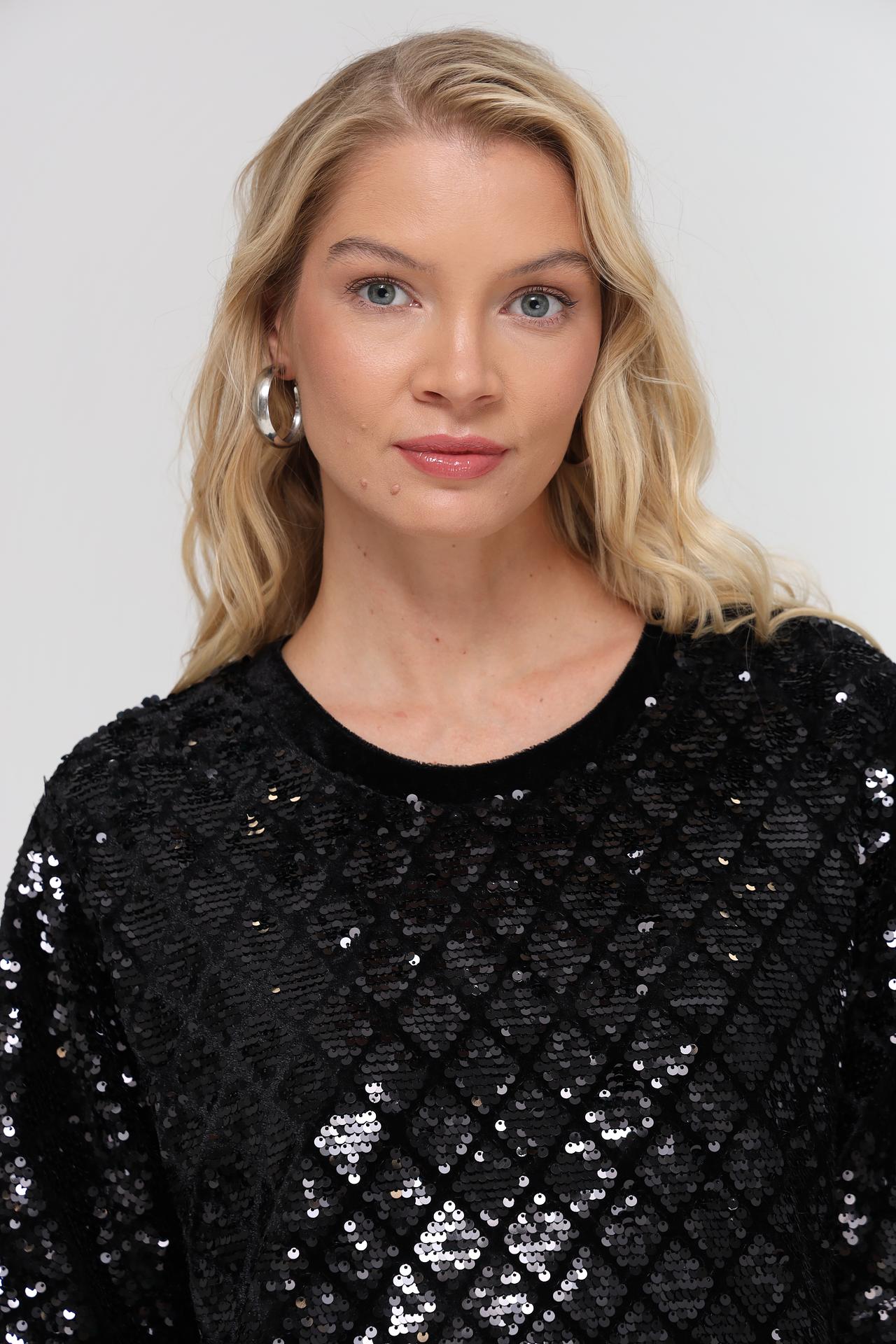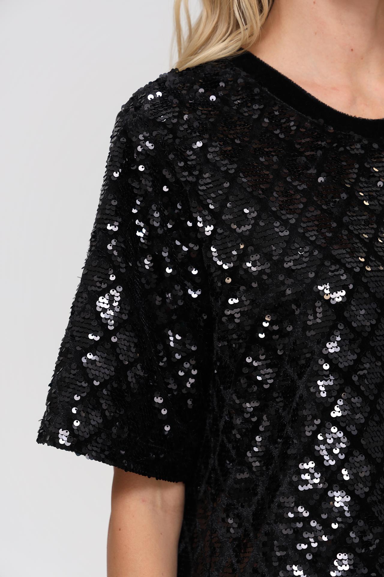 - Цвет: Глубокий чёрный цвет в сочетании с серебристыми переливами пайеток создает роскошный и элегантный вид.