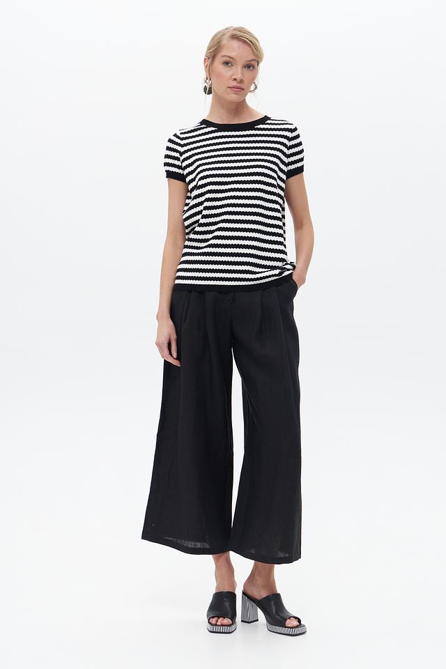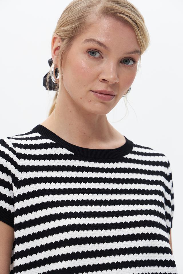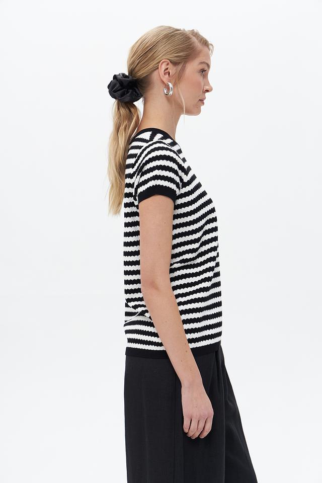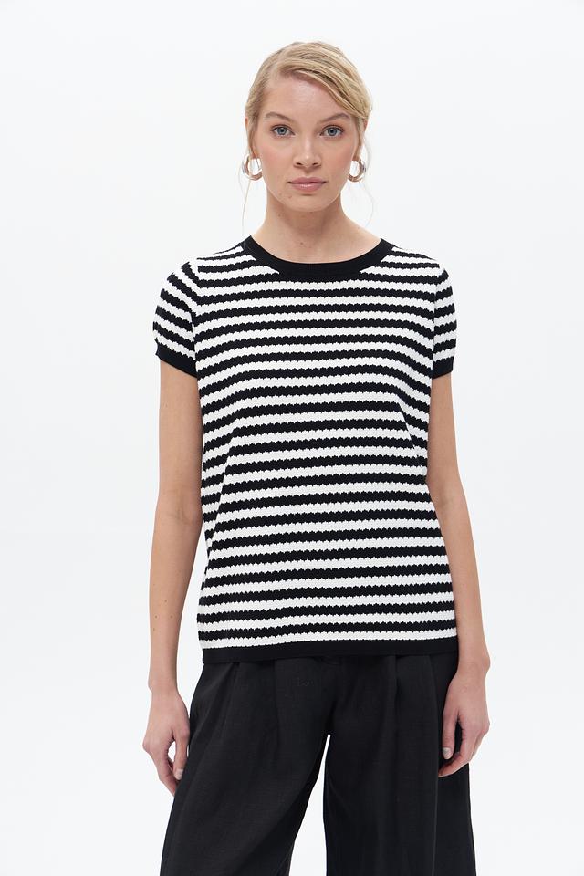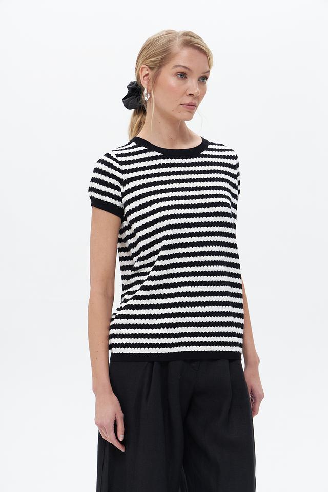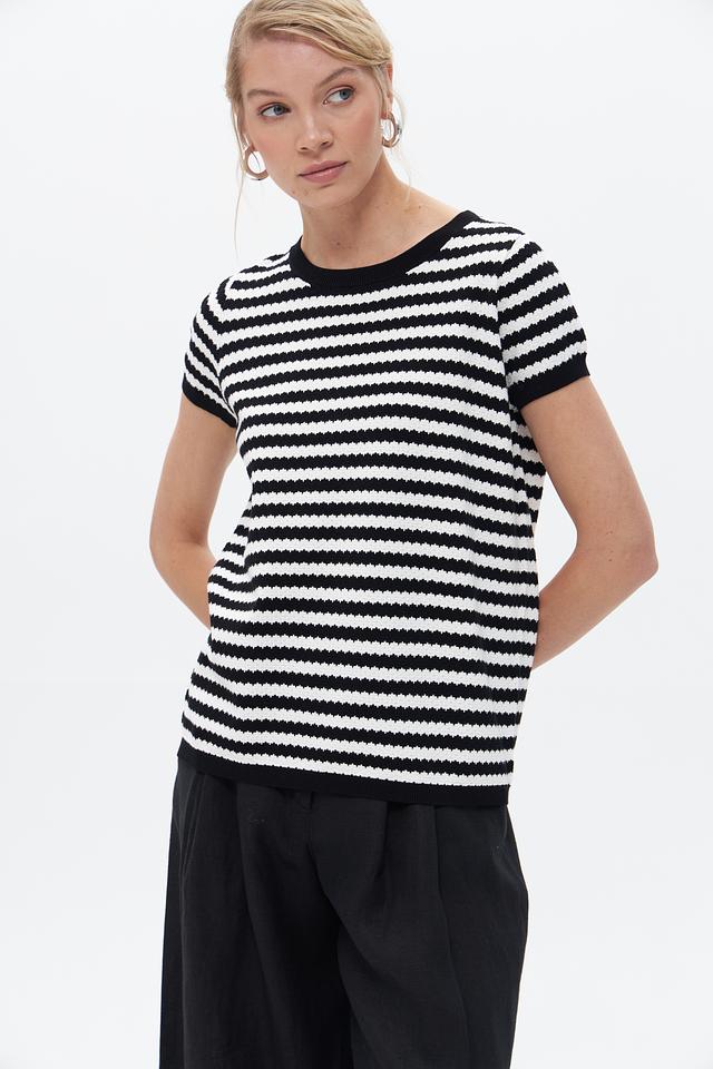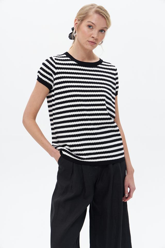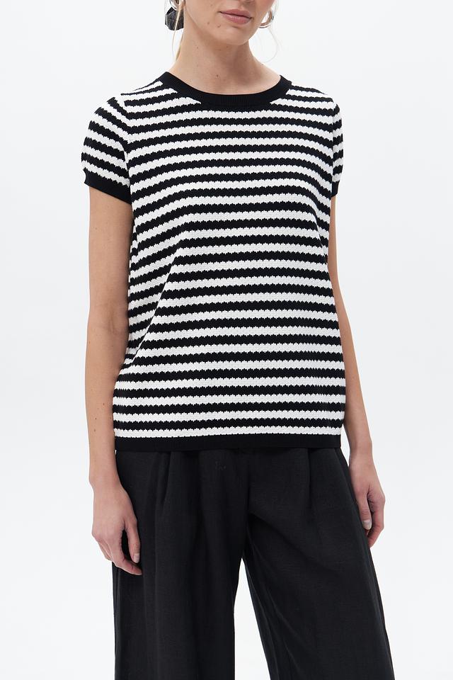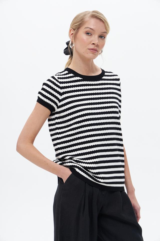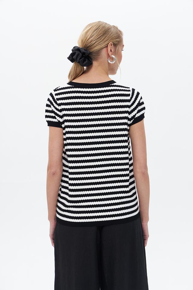 Женский пуловер UNQ чёрно-белого цвета с коротким рукавом и полосатым узором. Изготовлен из мягкой вискозы с добавлением полиамида для сохранения формы. Стильный и комфортный выбор для повседневного гардероба. Состав: вискоза 80%, полиамид 20%