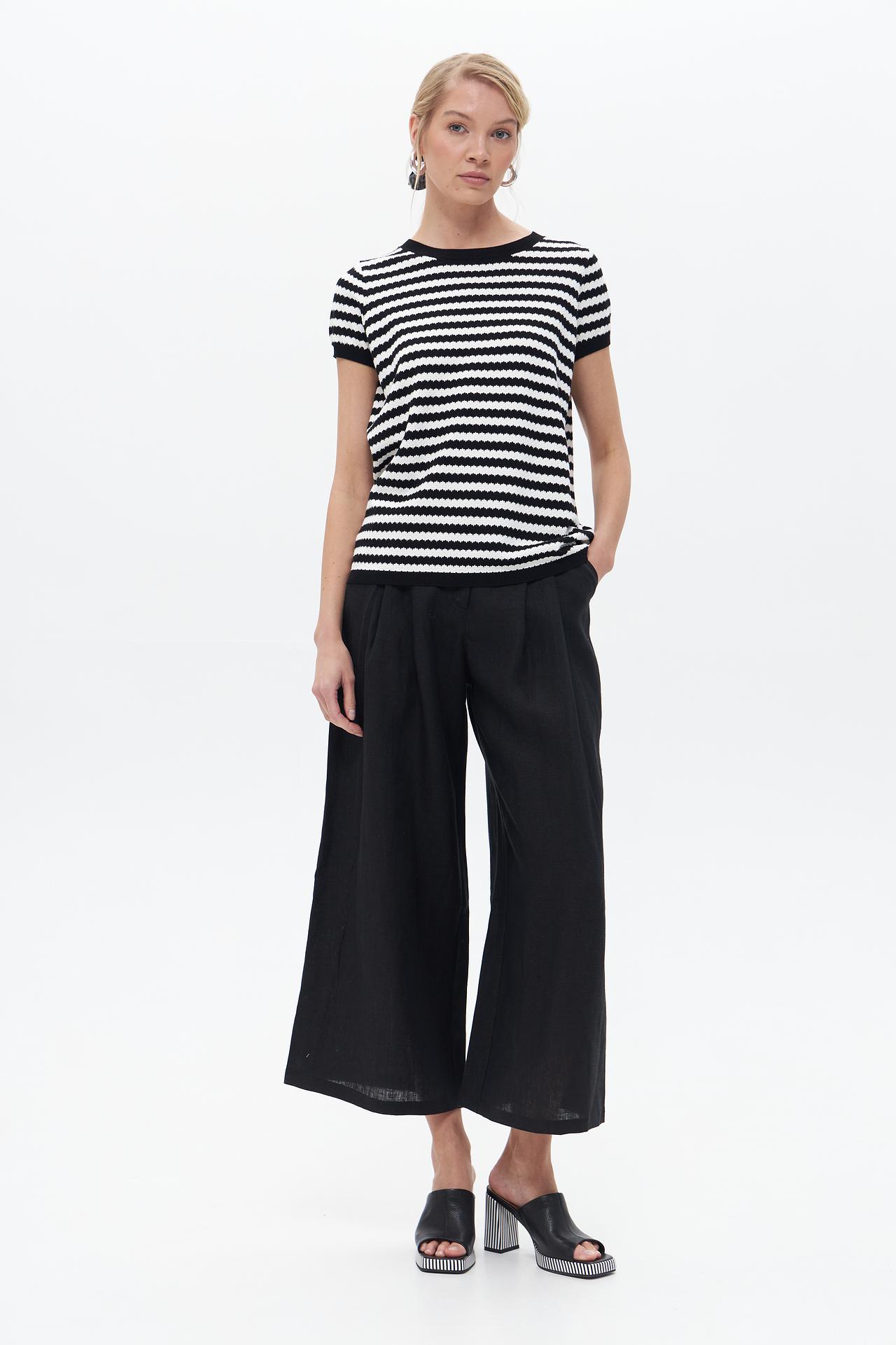Элегантный женский пуловер UNQ, выполненный в классическом черно-белом сочетании полосок, станет универсальным дополнением вашего гардероба. Модель с коротким рукавом и круглой горловиной идеально подходит для создания как повседневных, так и более изысканных образов. Мягкая и приятная на ощупь ткань обеспечивает комфорт при носке в течение всего дня.
