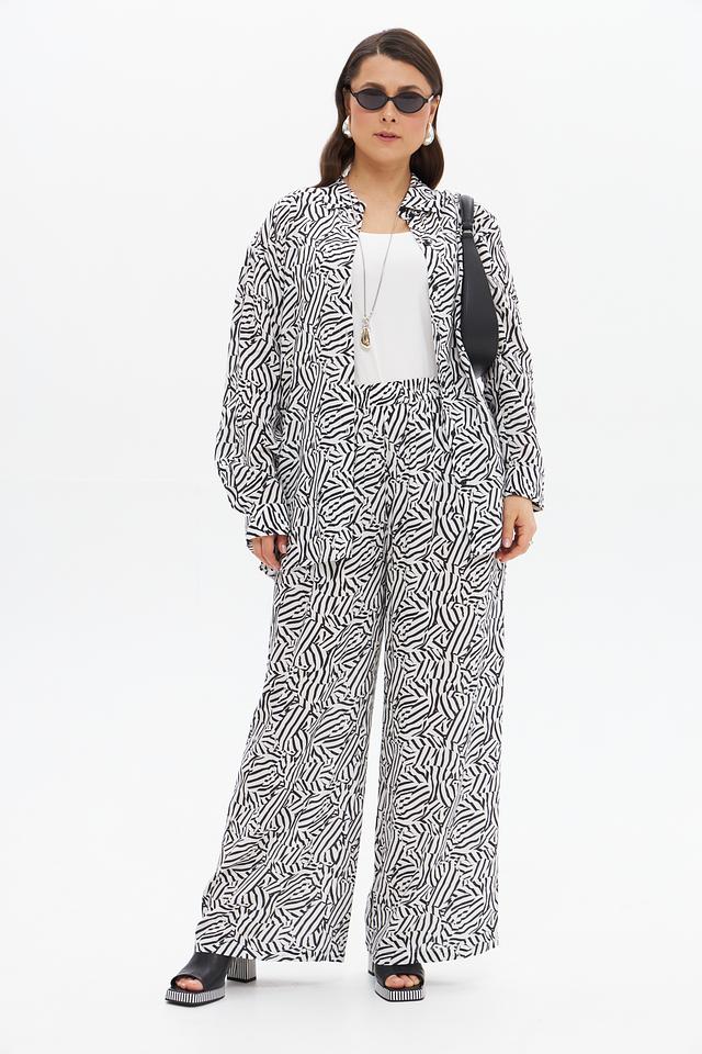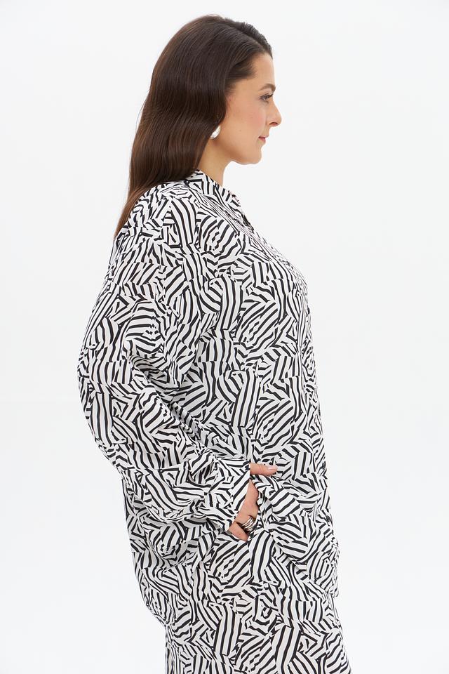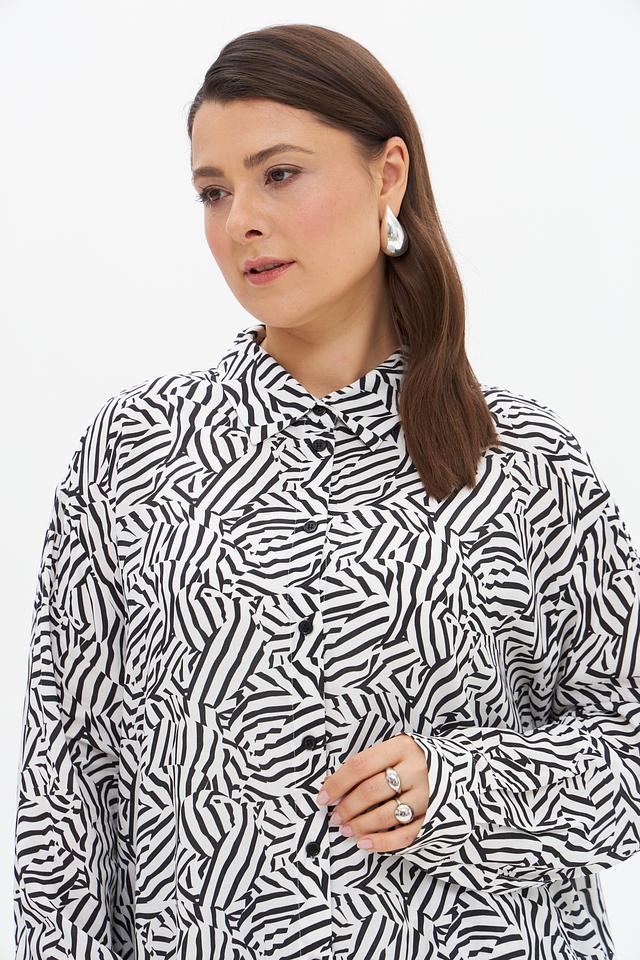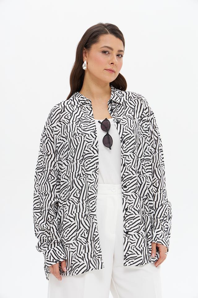 Эта блуза от UNQ – отличный выбор для создания модного и запоминающегося образа. Выполнена в контрастном чёрно-белом цвете с геометрическим принтом, имитирующим шкуру зебры.
