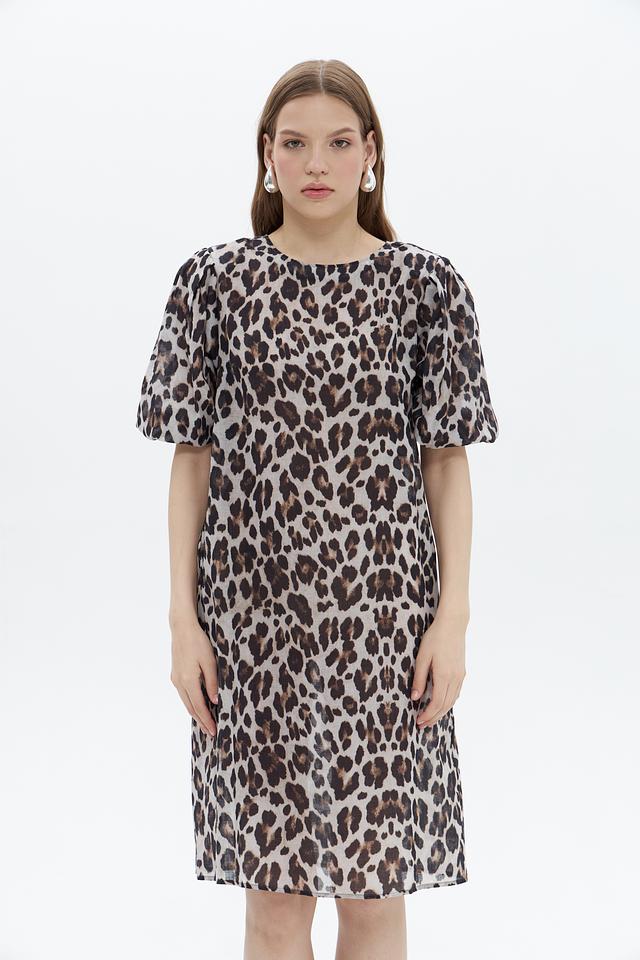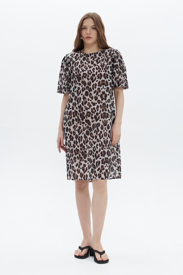 Это платье от UNQ выполнено в ярком леопардовом принте, что делает его акцентным элементом вашего гардероба. Модель имеет прямой крой, короткие рукава и круглый вырез горловины.