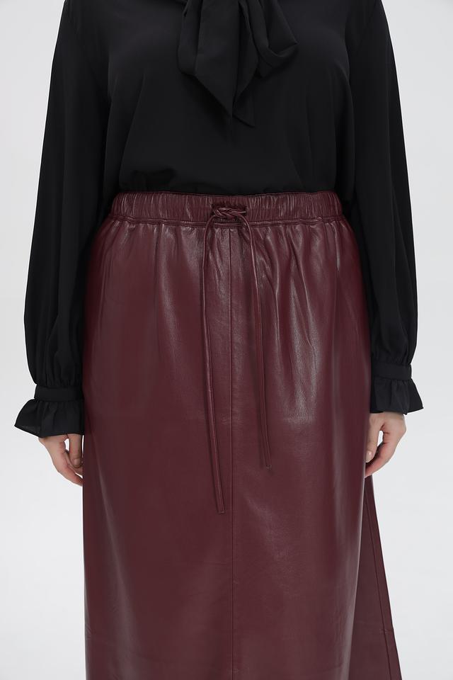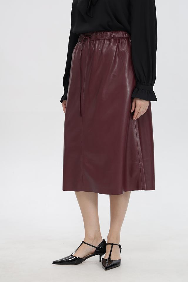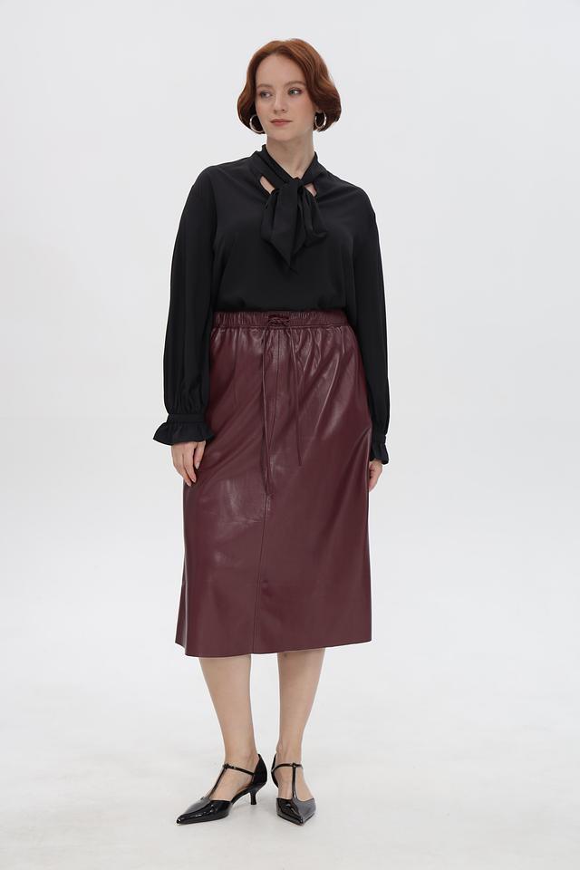 Модель выполнена в насыщенном бордовом цвете и имеет длину миди. Эластичный пояс с кулиской обеспечивает комфортную посадку по фигуре, а боковые завязки позволяют регулировать объем талии и создавать различные образы.