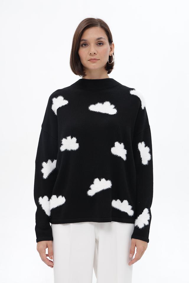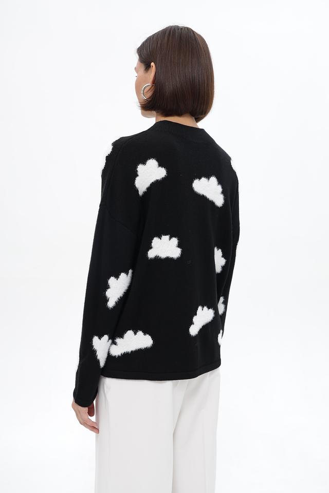 Чёрный пуловер от UNQ с оригинальным принтом в виде белых облаков. Изготовлен из мягкой смеси шерсти, полиакрила и полиамида, обеспечивающей комфорт и тепло. Идеально подходит для создания уютных и стильных образов. Состав: шерсть 44%, полиакрил 44%, полиамид 12%