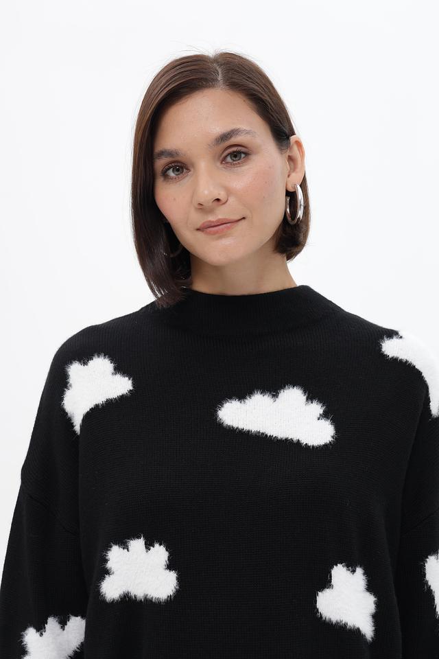 Этот стильный пуловер от UNQ станет ярким акцентом в вашем гардеробе. Основной цвет – чёрный, который выгодно подчеркнёт вашу индивидуальность. Передняя часть изделия украшена оригинальным принтом в виде пушистых белых облаков, добавляя образу игривости и лёгкости.