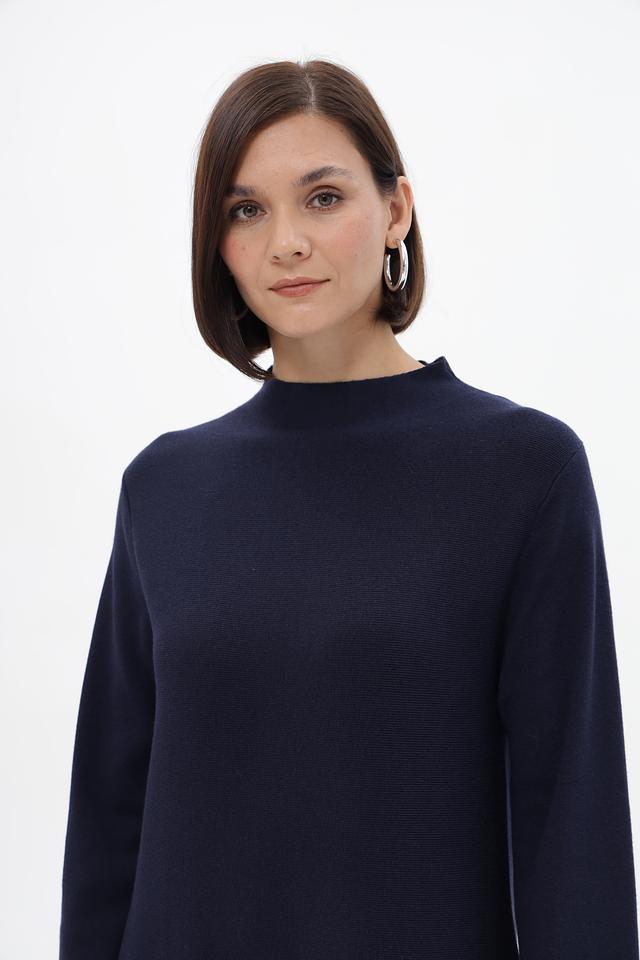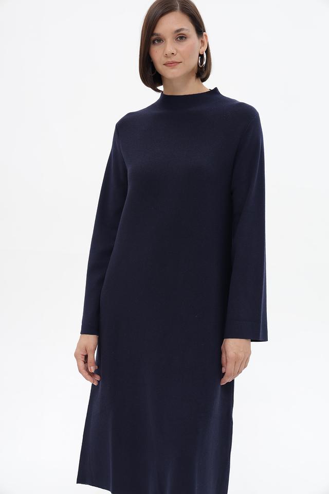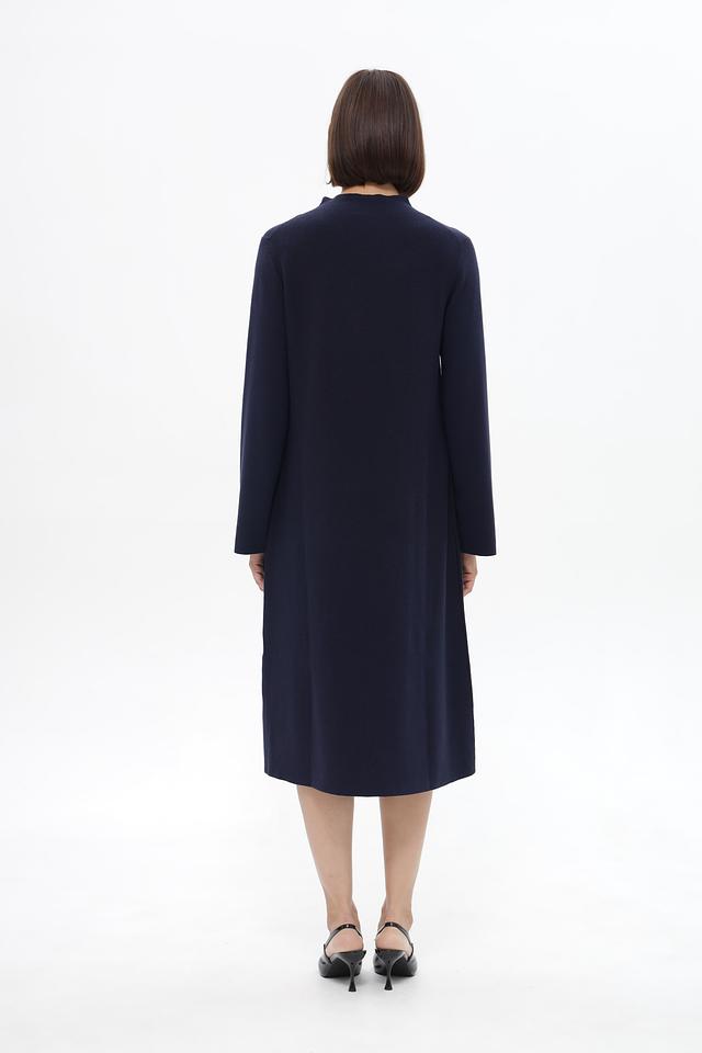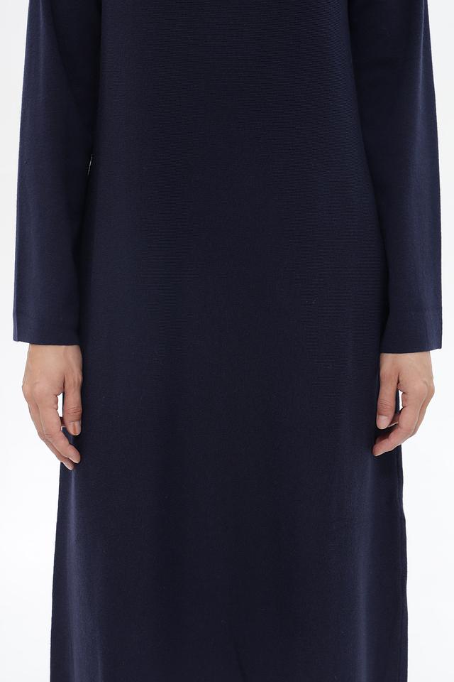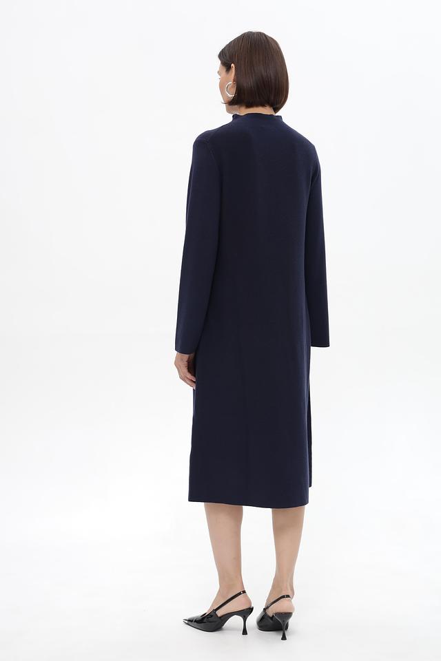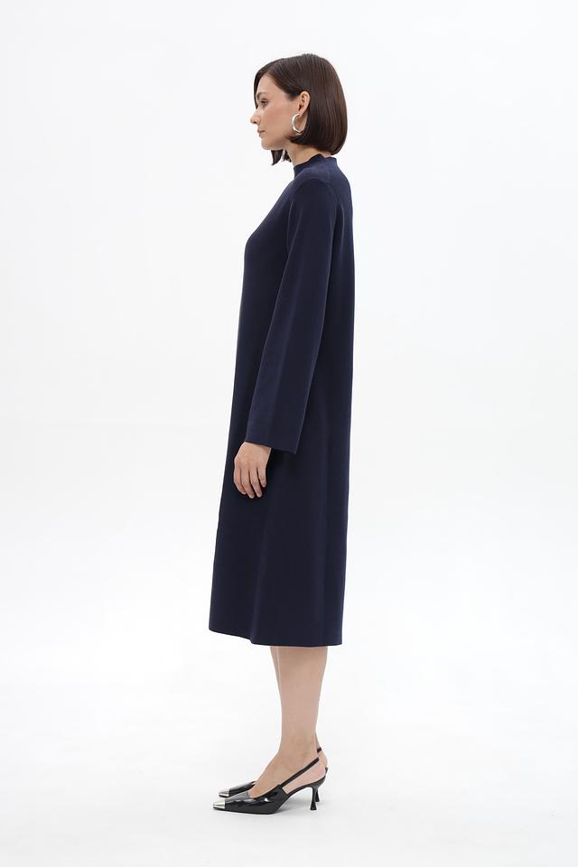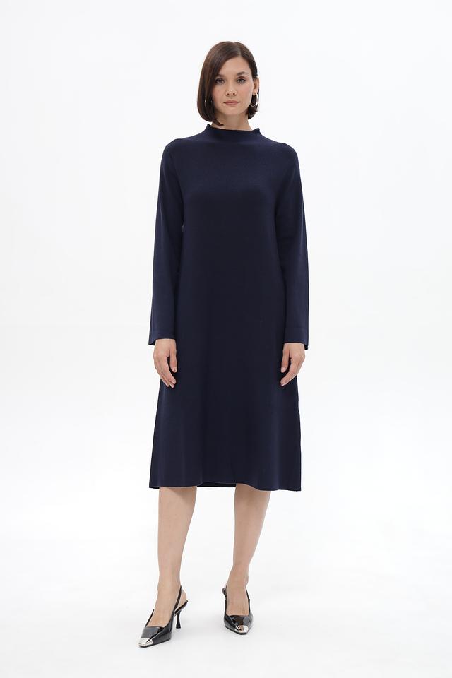 Темно-синее трикотажное платье UNQ прямого кроя длиной миди. Изготовлено из смесового состава с добавлением шерсти. Модель имеет высокий воротник-стойку и длинные рукава. Состав: полиэстер 50%, полиамид 23%, полиакрил 13%, вискоза 9%, шерсть 5%