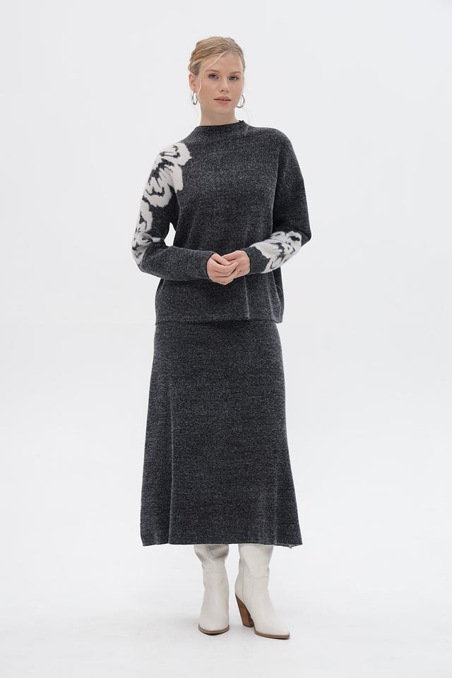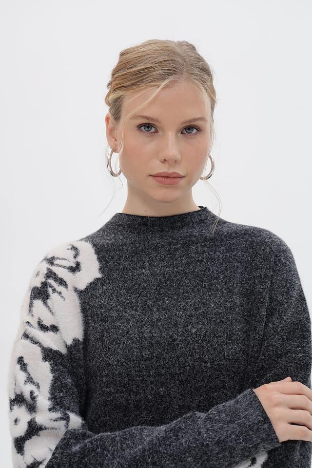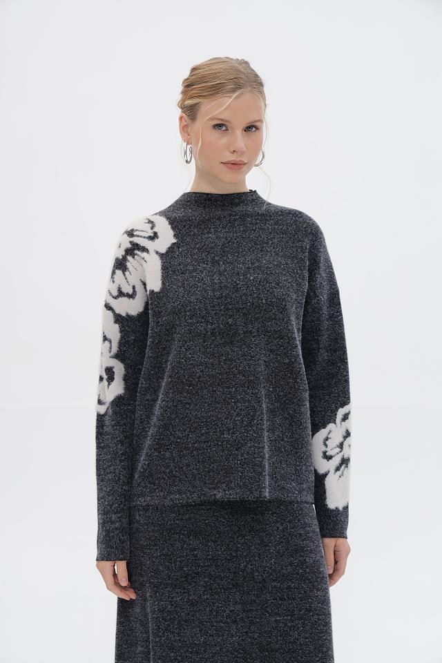 Пуловер имеет свободный крой и круглый вырез горловины. Основной цвет изделия – серый меланж, который отлично сочетается с белым цветочным принтом, расположенным на рукавах. Принт выполнен в виде крупных, абстрактных цветов, добавляющих образу оригинальность и выразительность.