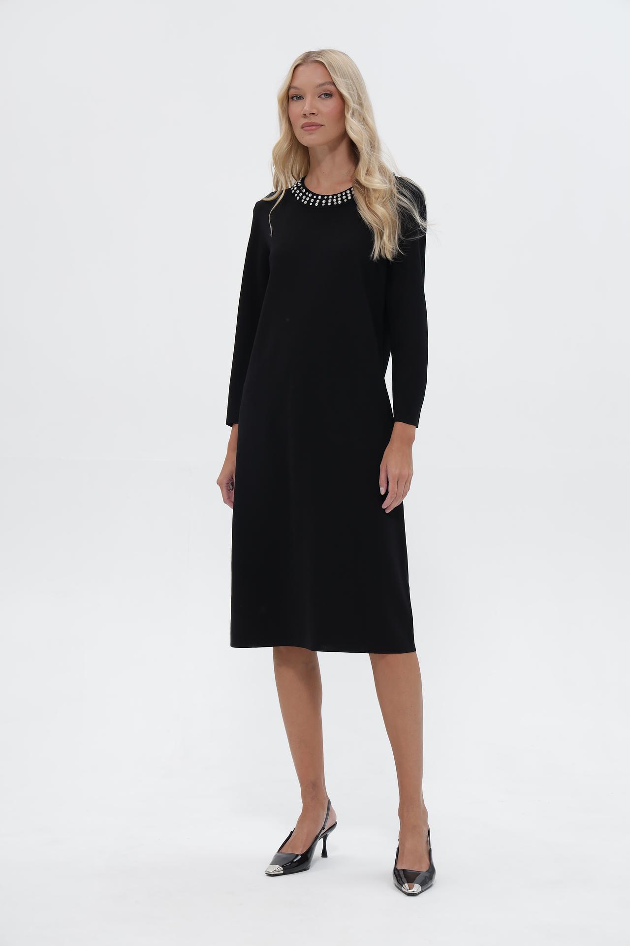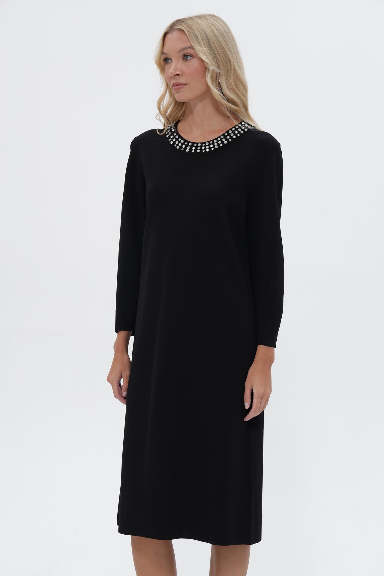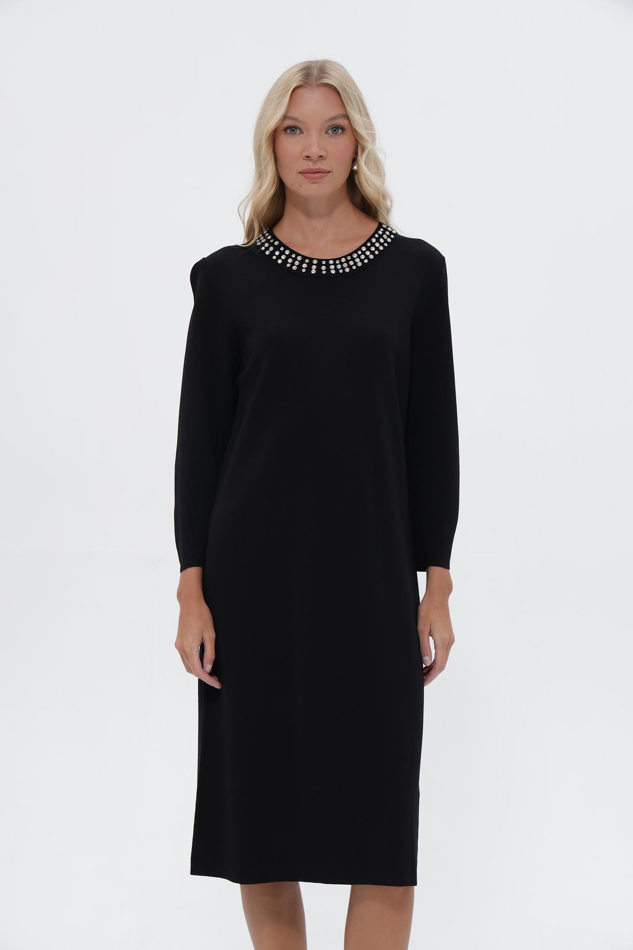 Элегантное трикотажное платье UNQ — идеальный выбор для создания утонченного образа. Модель выполнена в классическом черном цвете и дополнена изысканным декором из страз вокруг горловины, придающим изделию особую привлекательность. Длина миди и прямой силуэт обеспечивают комфорт и свободу движений, а рукав 3/4 добавляет образу завершенности.