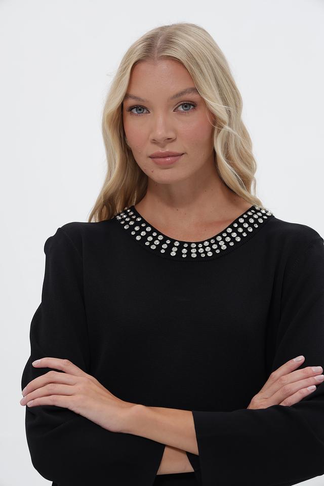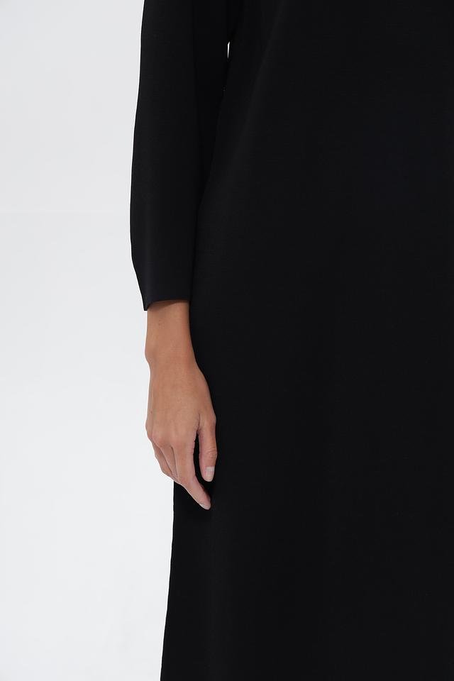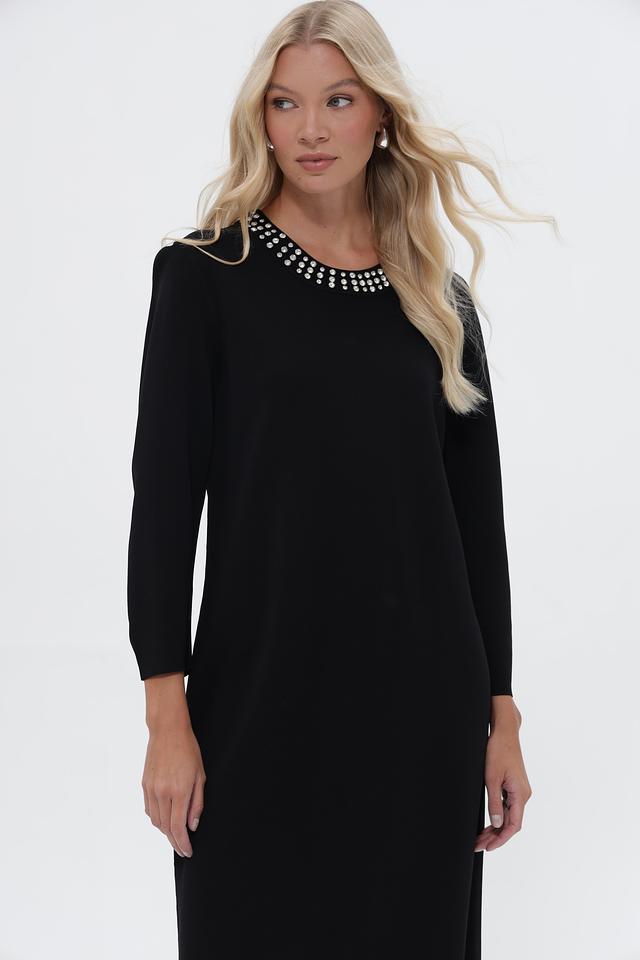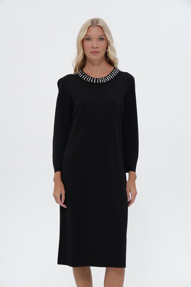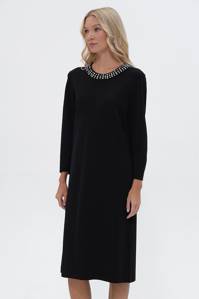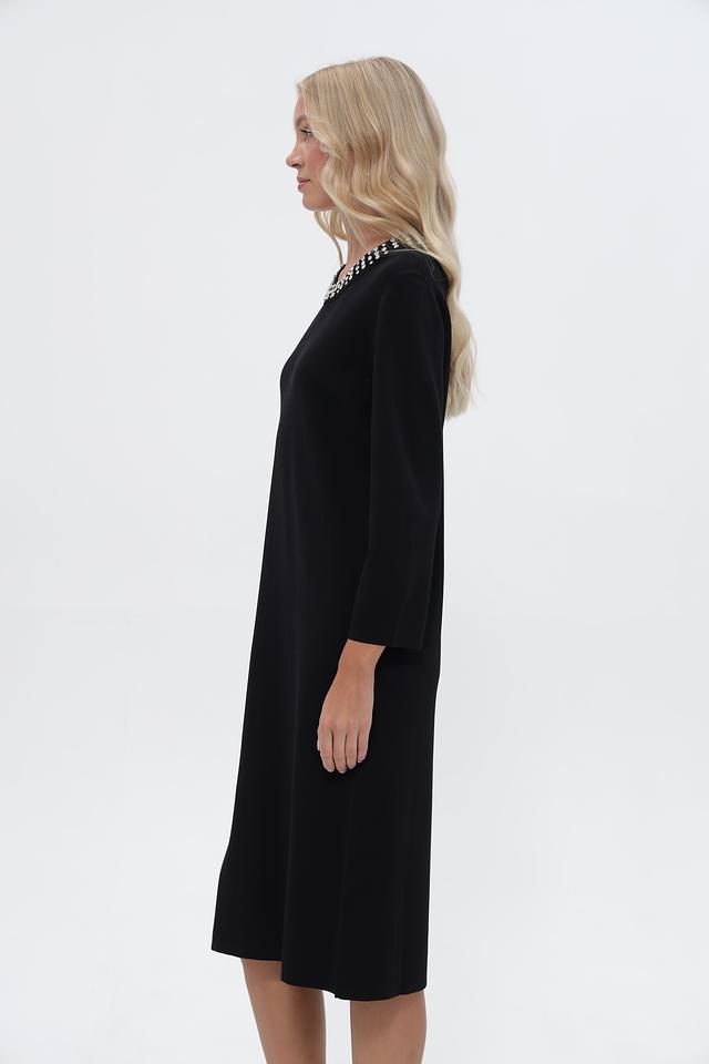 Чёрное платье UNQ длиной миди с округлым вырезом, украшенным жемчужным декором. Изготовлено из вискозы с добавлением нейлона для комфорта и износостойкости. Состав: вискоза 80%, нейлон 20%