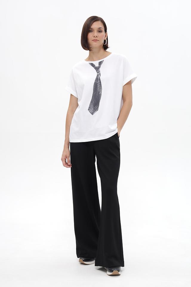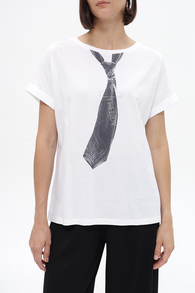 Особенностью данной футболки является оригинальный принт в виде галстука, который добавляет образу нотку индивидуальности и стиля. Футболка имеет круглый вырез горловины, что делает ее универсальной для различных типов фигуры.