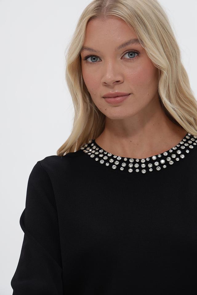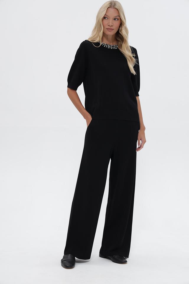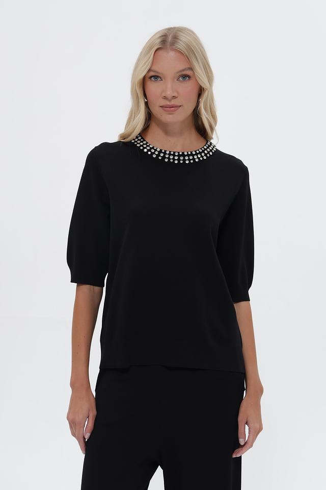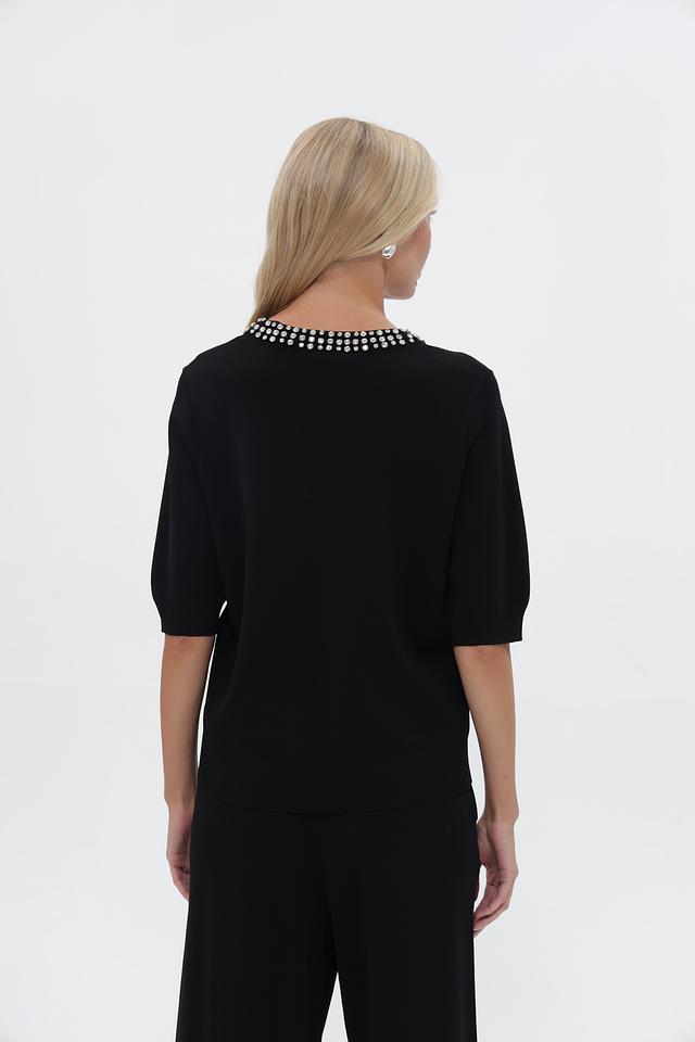 Чёрный пуловер от UNQ с изящным декором из бусин на горловине. Изготовлен из вискозы с добавлением полиамида для комфорта и лучшей посадки. Подчеркнёт ваш стиль и добавит элегантности образу. Состав: вискоза 80%, полиамид 20%